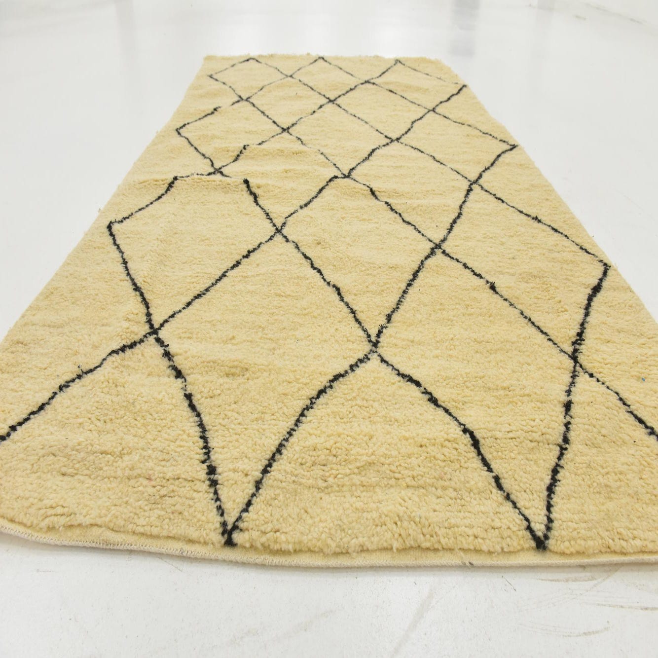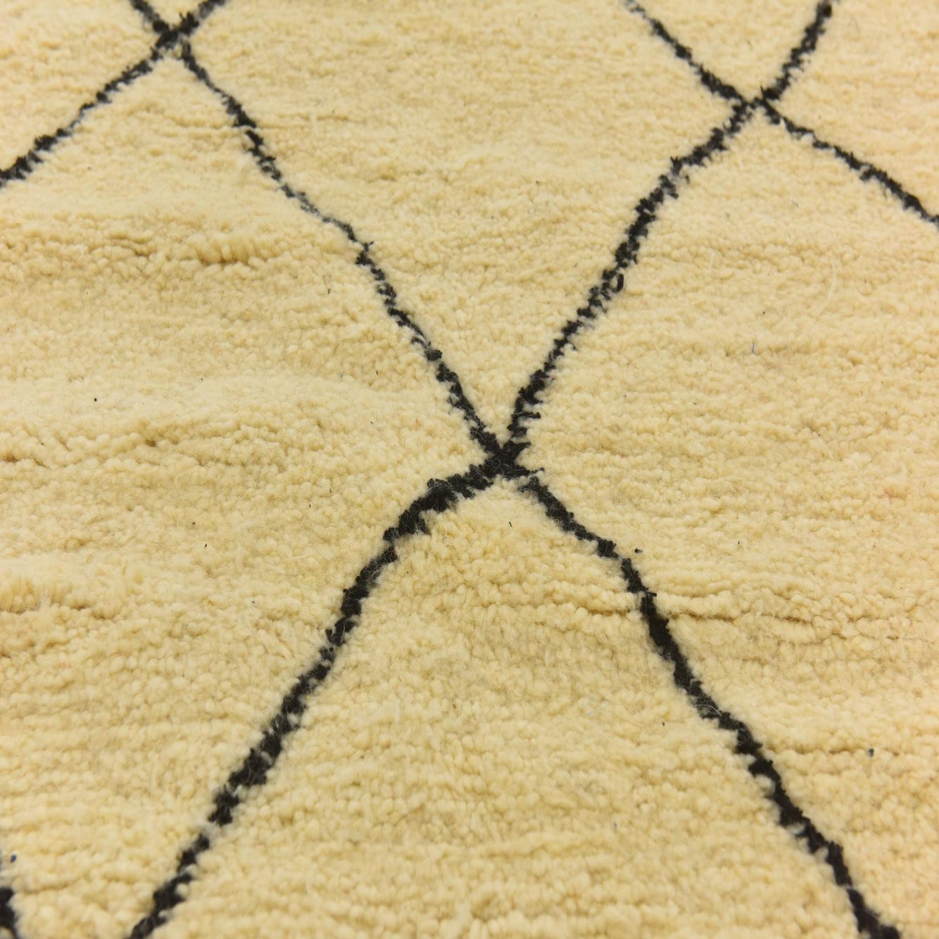 This Moroccan collection rug presents a simplistic yet compelling diamond lattice pattern set against an inviting ivory background, which offers a versatile look suitable for a range of interiors. Hand-knotted from 100% wool, the rug's texture is characteristically plush and warm underfoot, making it a comfortable choice for living spaces and bedrooms. The black geometric lines provide a striking contrast that complements modern, Scandinavian, or minimalist design schemes, while the semi-antique age adds a touch of timeless charm to any setting.