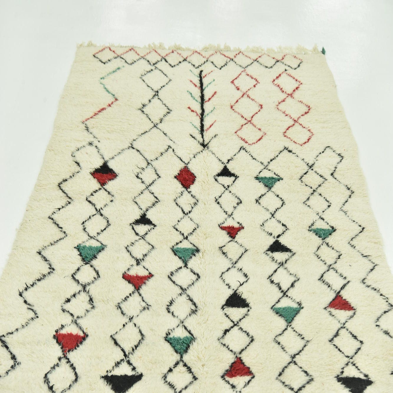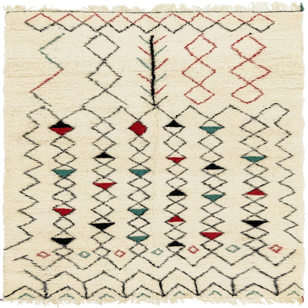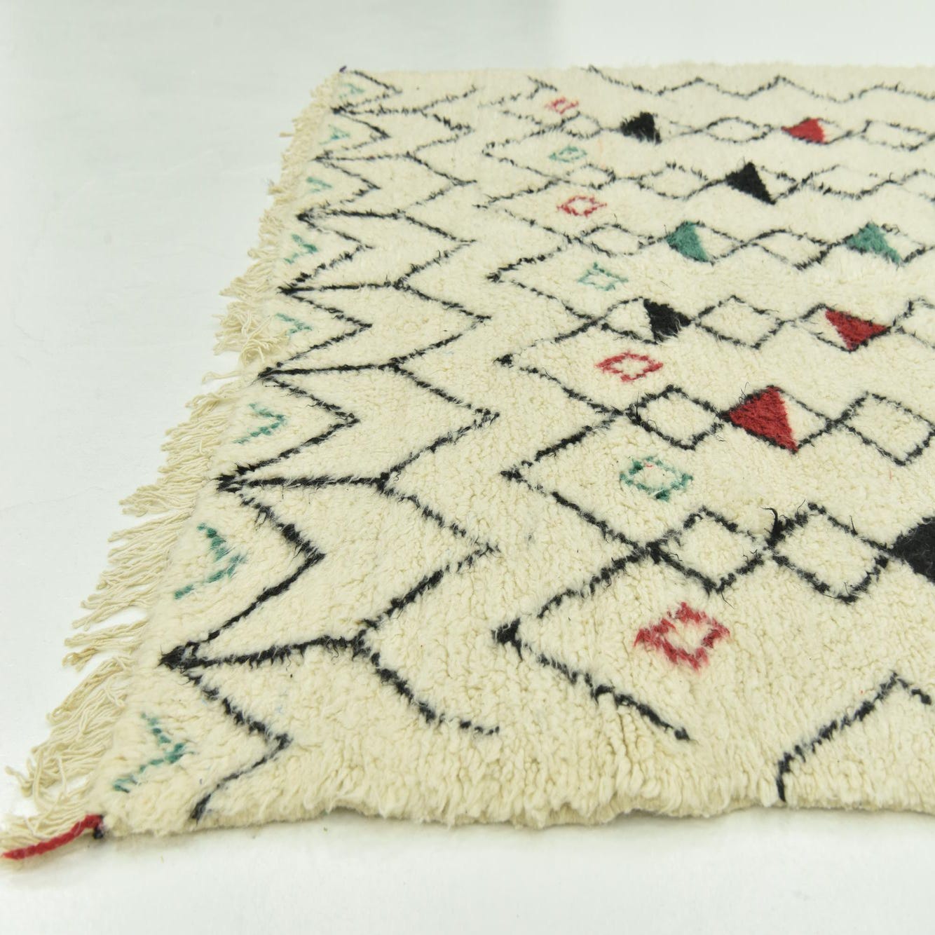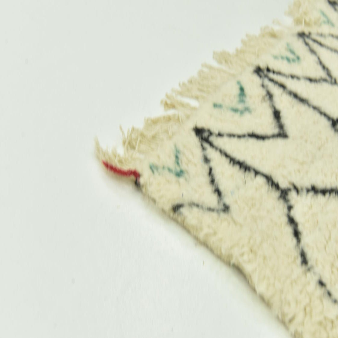 This Moroccan Collection rug brings a touch of global elegance with its hand-knotted 100% wool construction, offering a plush and tactile surface. At 5x8 feet, this piece is articulated through an ivory background, which provides a serene canvas for the intricate black geometric pattern that adorns it. Accents of green and red punctuate the design, adding depth and a subtle hint of color to the overall aesthetic.