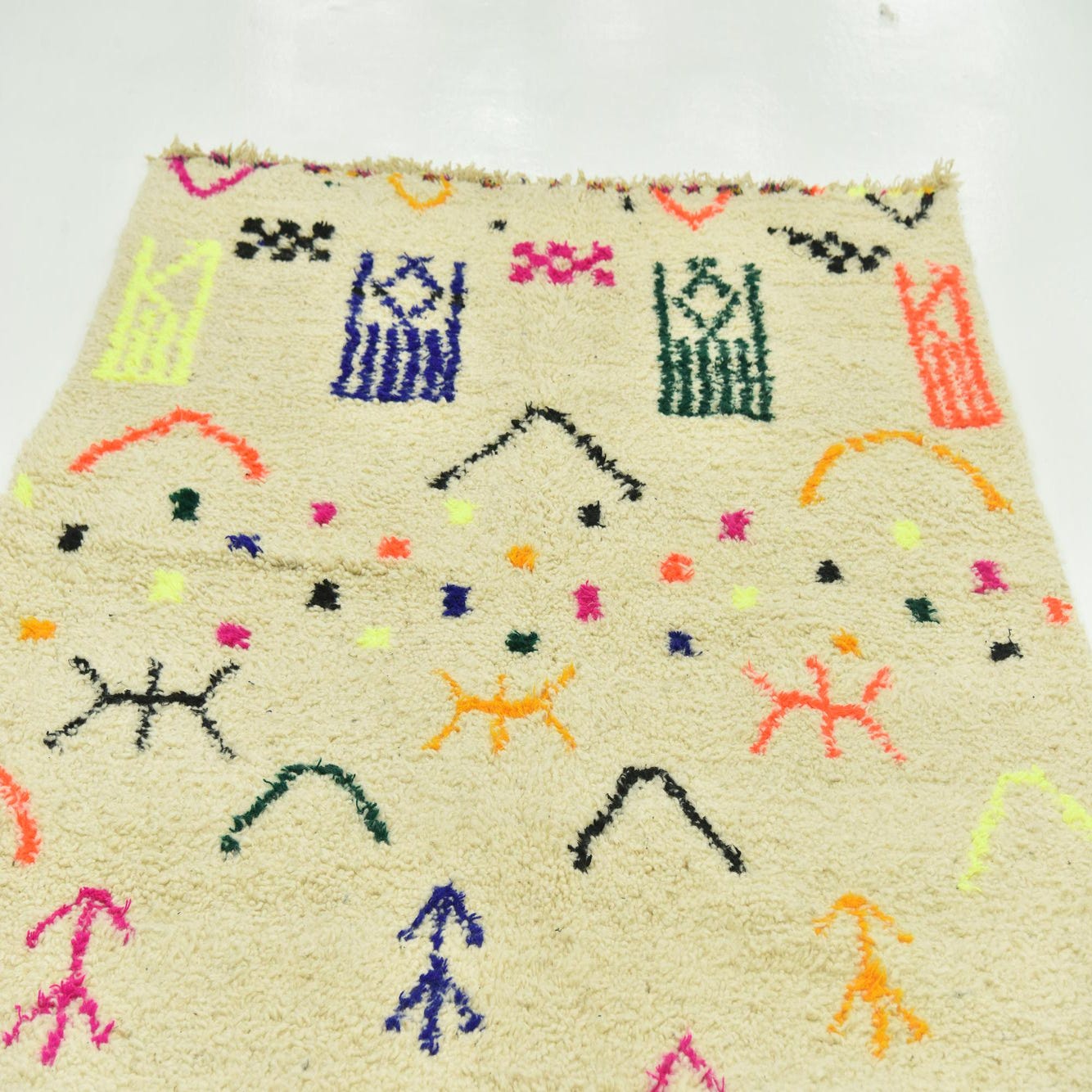 A soft ivory field provides a neutral, warm foundation for a lively array of tribal-inspired motifs. Scattered diamond lozenges, arch shapes, arrowheads and vertical column patterns are hand-knotted in black, blue, gold, green, orange, purple, red, pink and yellow, forming an informal, rhythmic composition across the pile. The surface is hand-knotted from 100% wool, creating a dense, tactile pile that feels cushioned underfoot and shows subtle variation where the colored knots meet the ivory background; a short fringe finishes one edge for a handcrafted look.