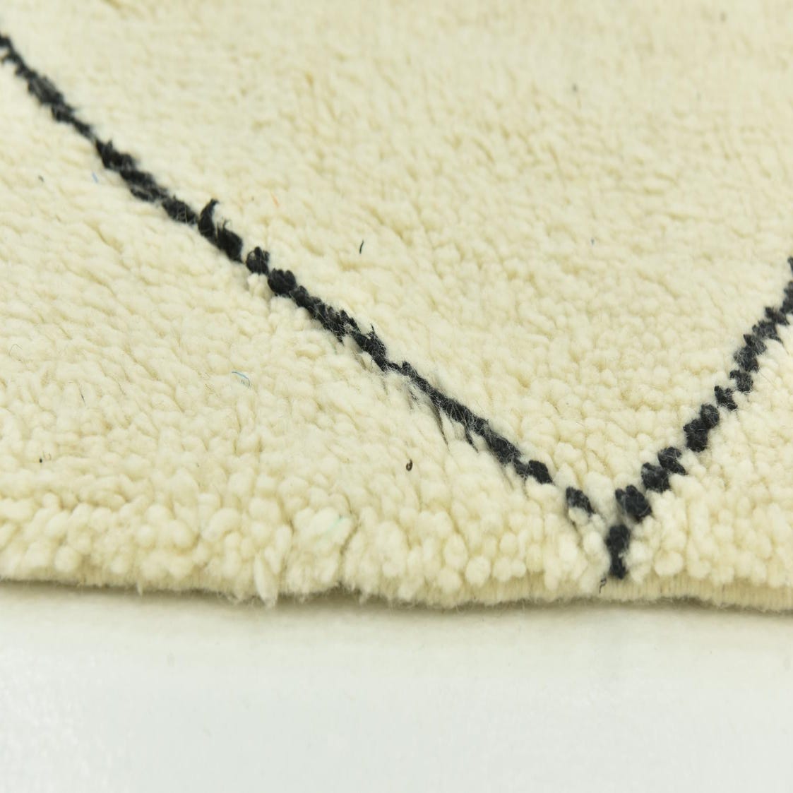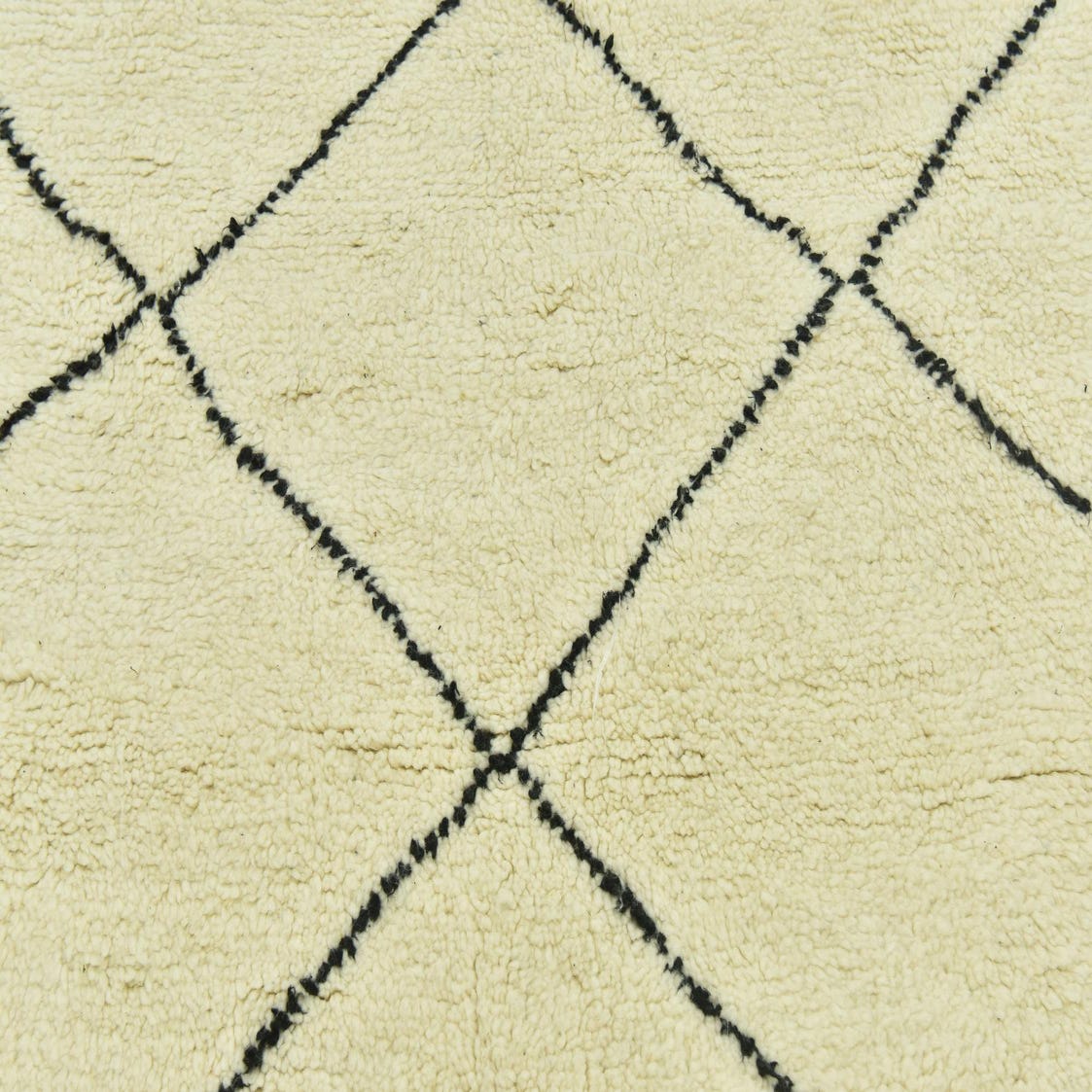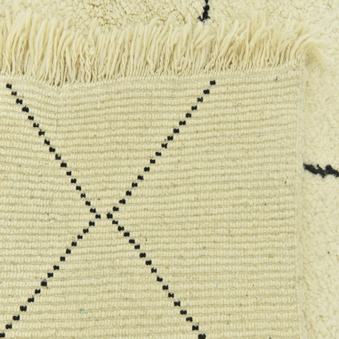 Hand-knotted from 100% wool, this rug pairs a soft ivory field with a bold, hand-drawn black diamond lattice. The irregular, slightly broken lines give the design an artisanal, lived-in character while the ivory background keeps the overall look light and versatile. The pile is plush and dense—you can feel a gentle cushion underfoot—while the short fringe at one end adds a casual, handcrafted finish.