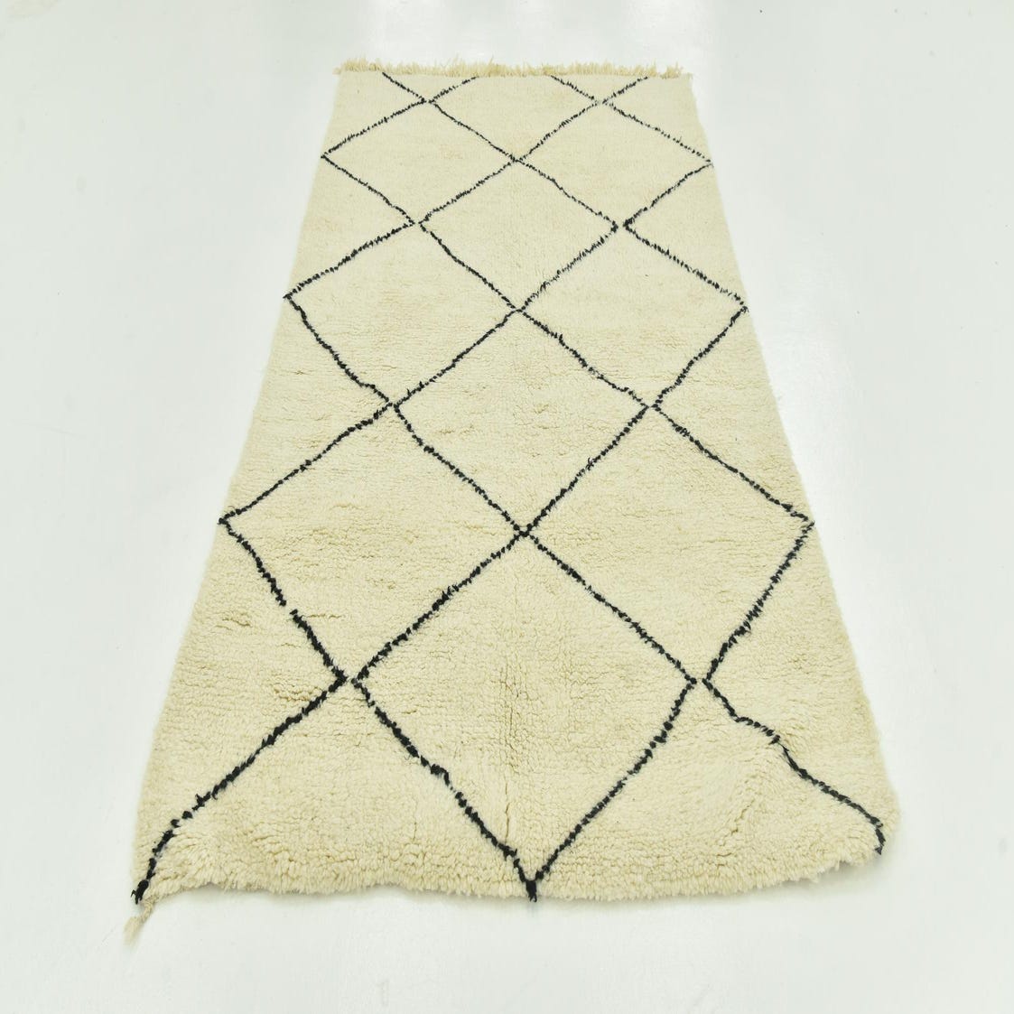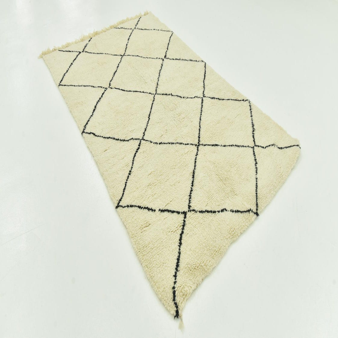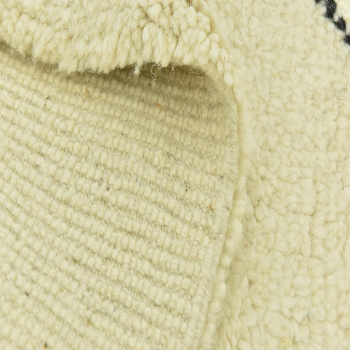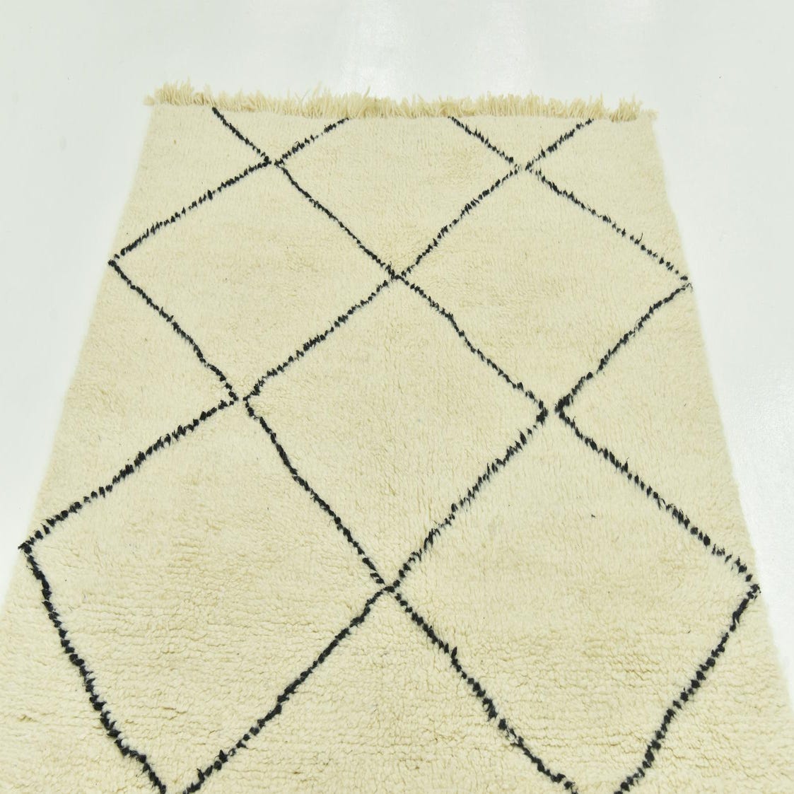 Hand-knotted from 100% wool, this rug pairs a soft ivory field with a bold, hand-drawn black diamond lattice. The irregular, slightly broken lines give the design an artisanal, lived-in character while the ivory background keeps the overall look light and versatile. The pile is plush and dense—you can feel a gentle cushion underfoot—while the short fringe at one end adds a casual, handcrafted finish.