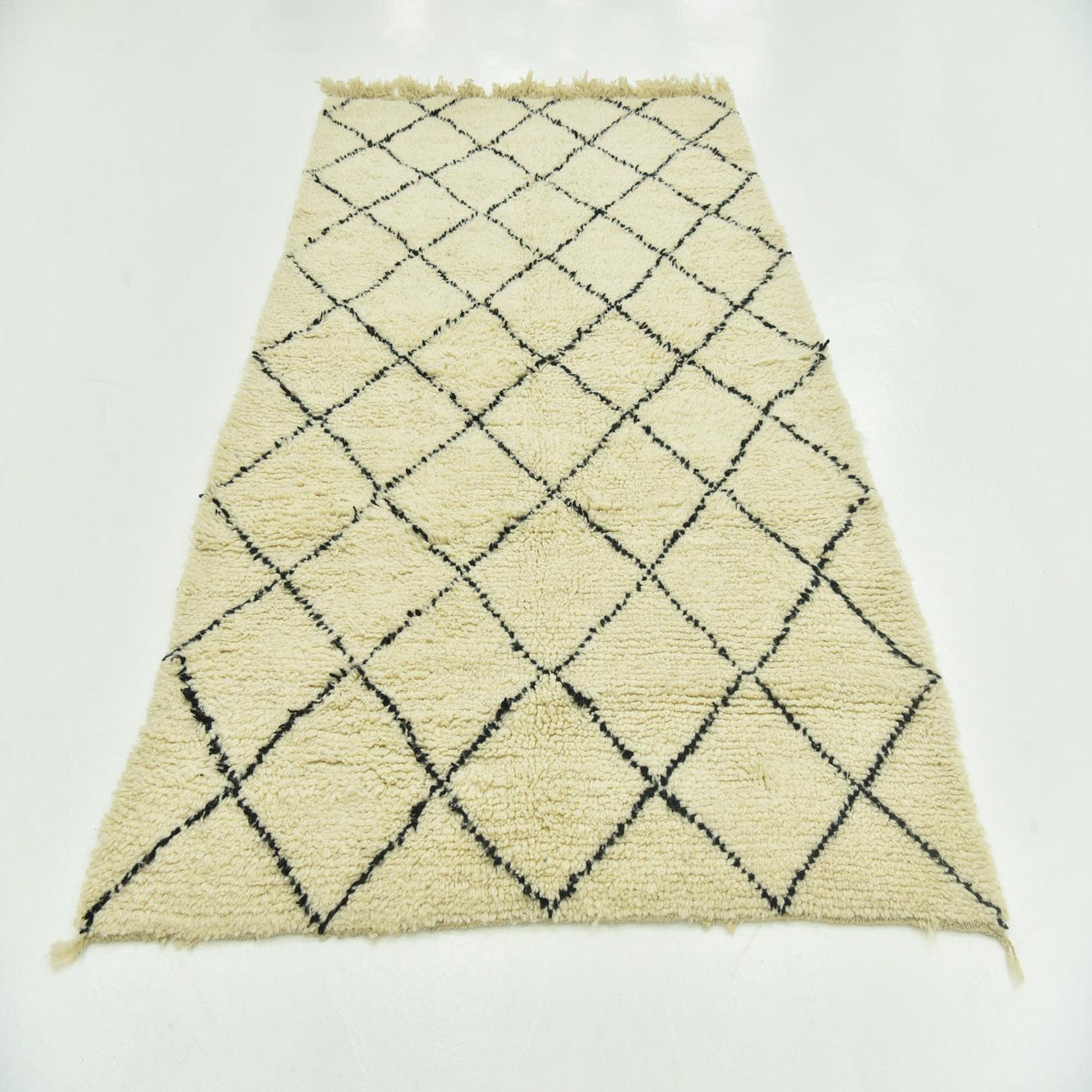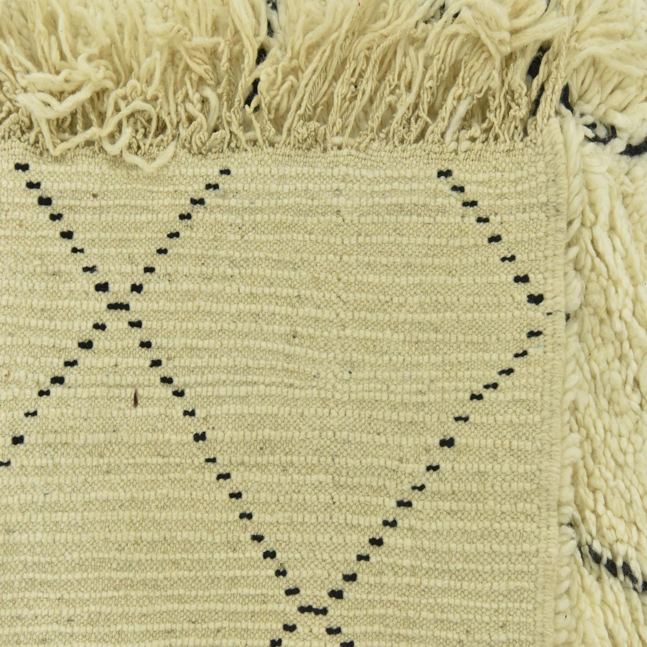 A 5x8 rectangular ivory shag rug with a black tribal diamond pattern and fringe, perfect for a living room.