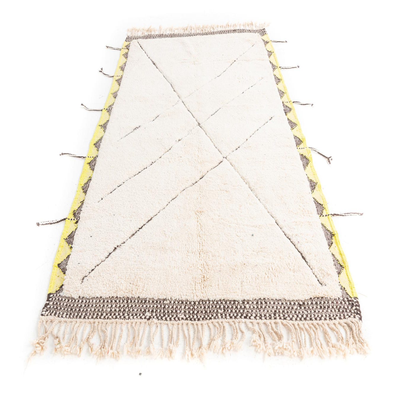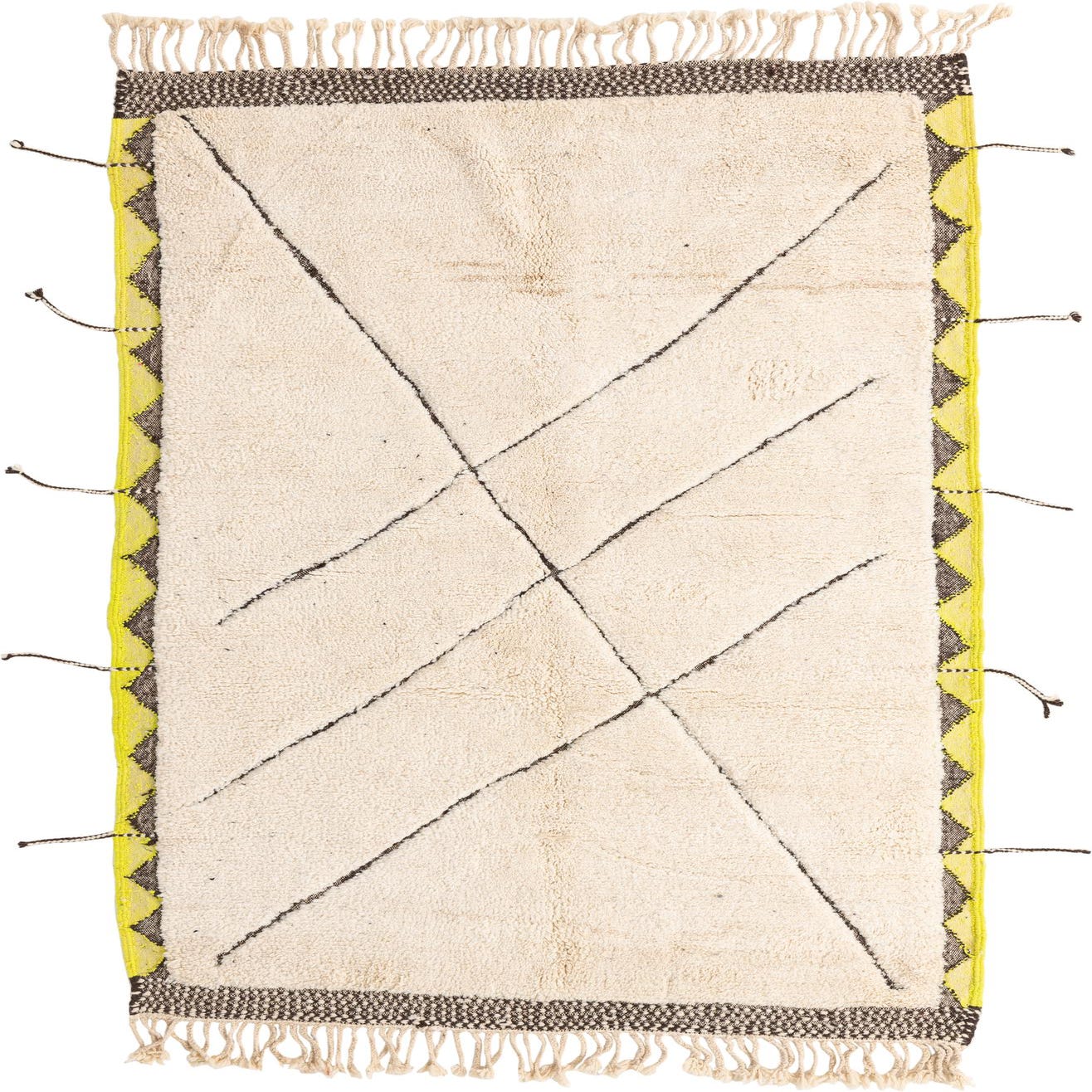 A 5x8 rectangular ivory shag rug with black tribal lines and a bright yellow and black patterned border, featuring tassels.
