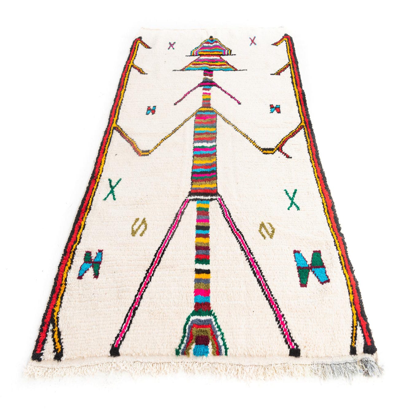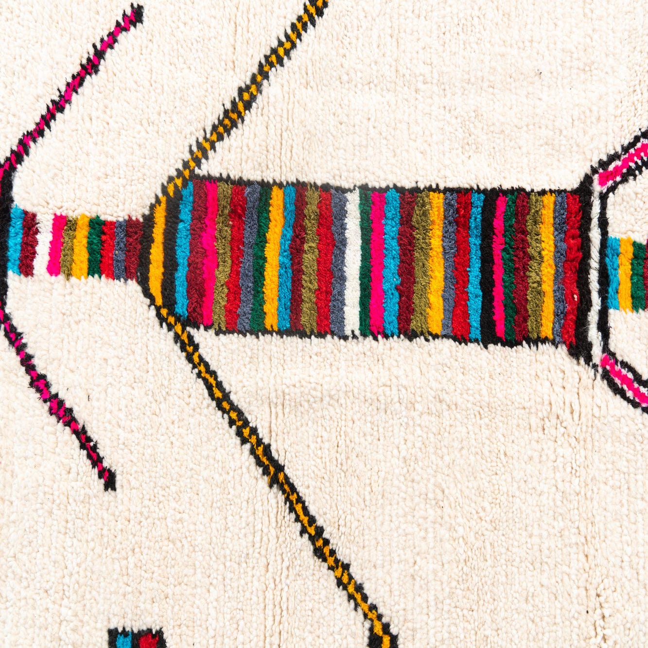 Hand-knotted of 100% wool, this rug presents an ivory field punctuated by a central, totem-like stripe of tightly packed, multicolored bands. Geometric motifs — small X marks, butterfly-like forms and angled border lines — are worked in black, blue, olive, red, yellow, pink and purple, giving the surface a lively, graphic feel. The wool pile is soft and tactile with a slightly textured, resilient finish that cushions underfoot and shows subtle variation from knot to knot.