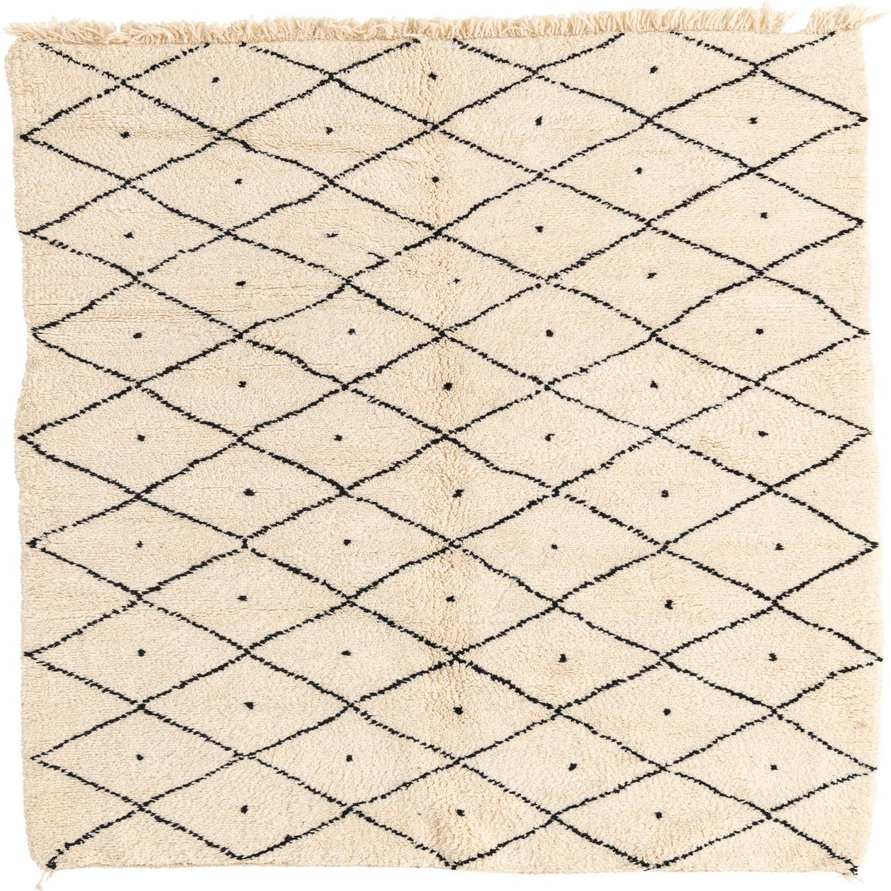 A rectangular 5x8 ivory shag rug with a black tribal diamond pattern and fringe, suitable for a living room.