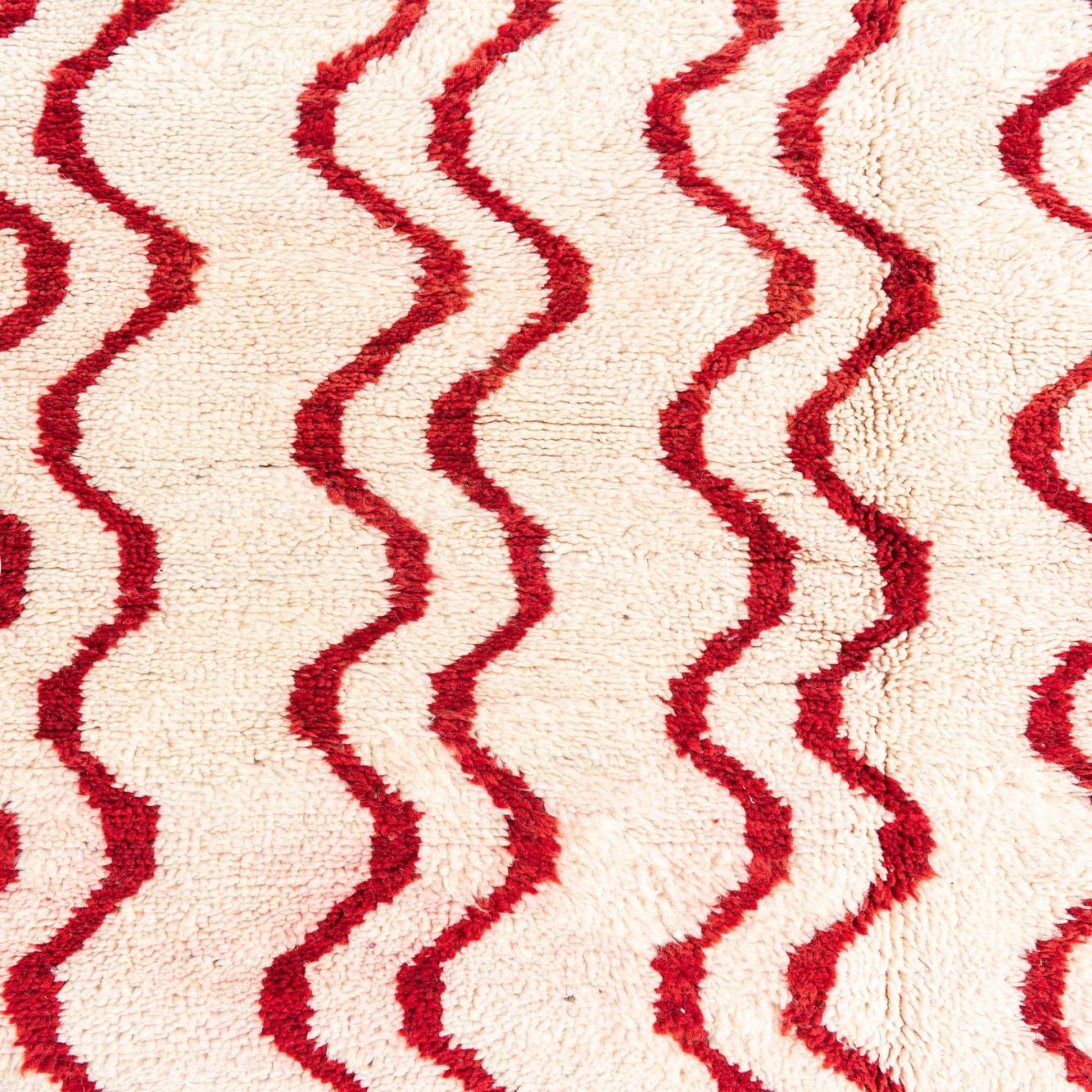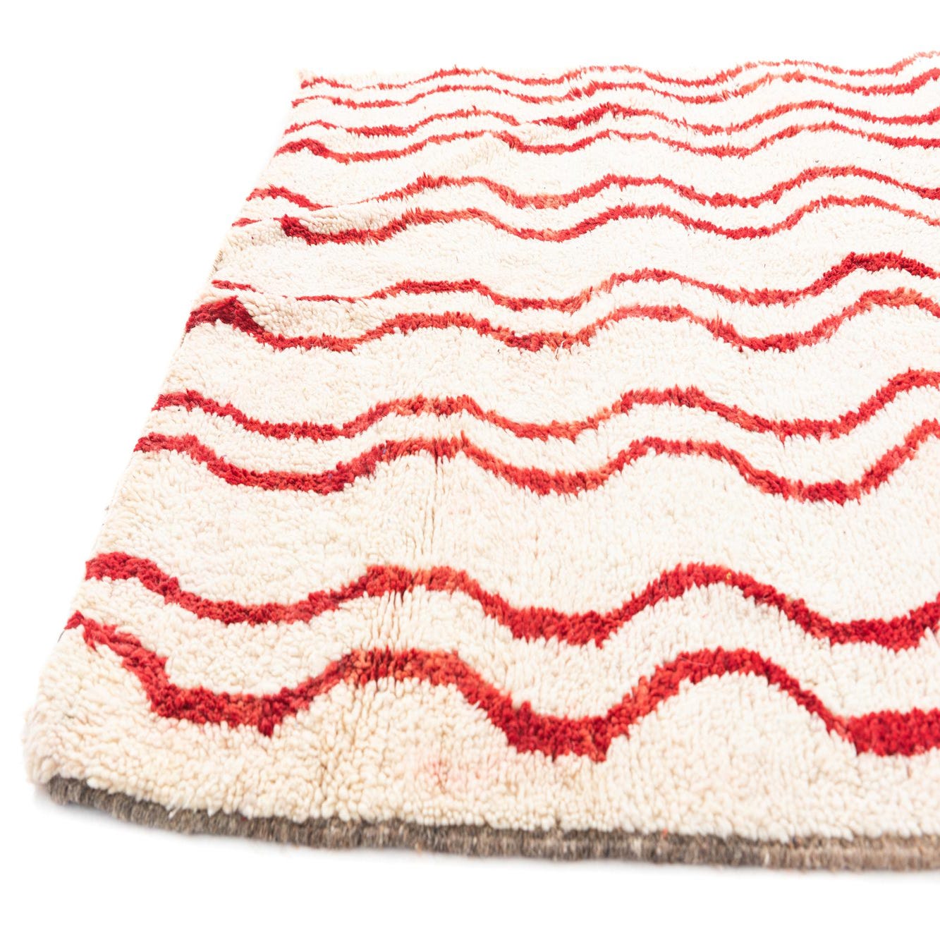 A 5x8 rectangular ivory shag rug with bold red wavy stripes and a green and black abstract tribal pattern at one end.