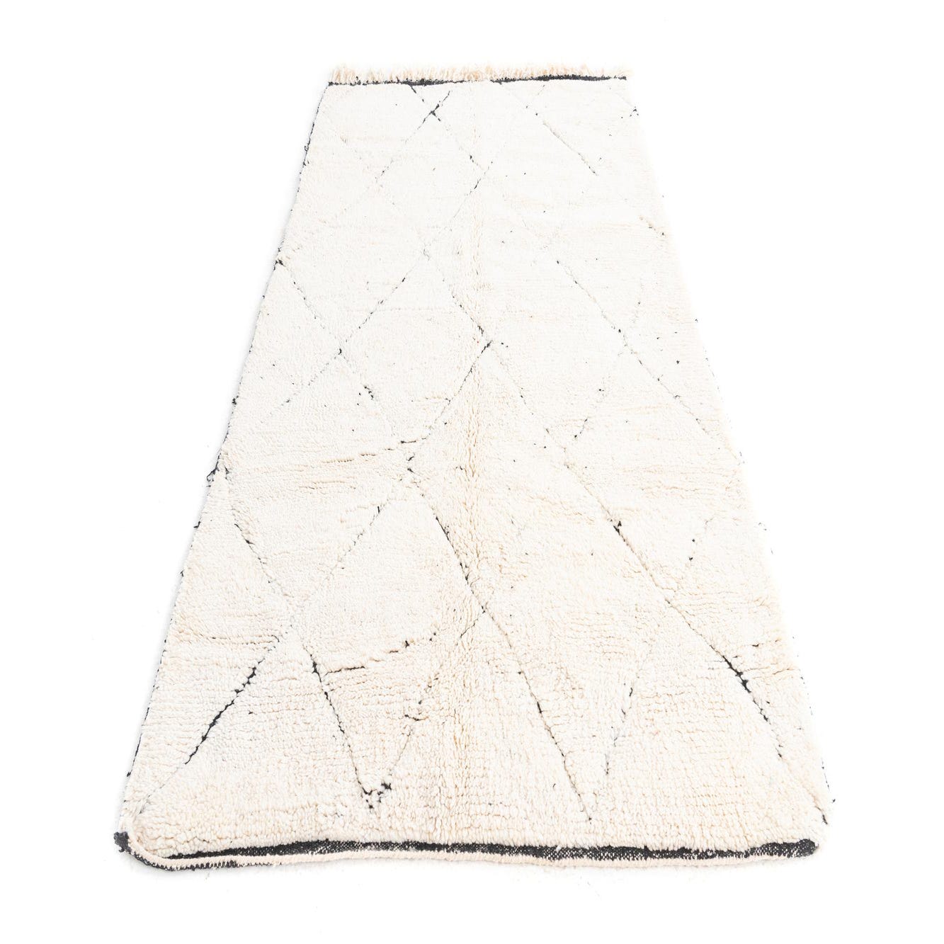 A 5x8 rectangular ivory shag rug with a black tribal diamond pattern and fringe, suitable for a living room.
