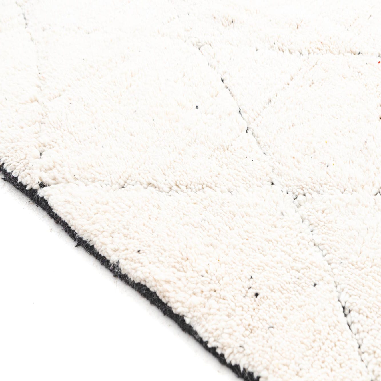 This Moroccan collection rug offers a minimalist design with its ivory background punctuated by a simplistic black geometric diamond pattern. As a hand-knotted piece crafted from 100% wool, this rug exhibits a pleasantly tactile texture characteristic of traditional Moroccan craftsmanship. The dimensions of 5x8 make it a versatile choice for a variety of spaces.