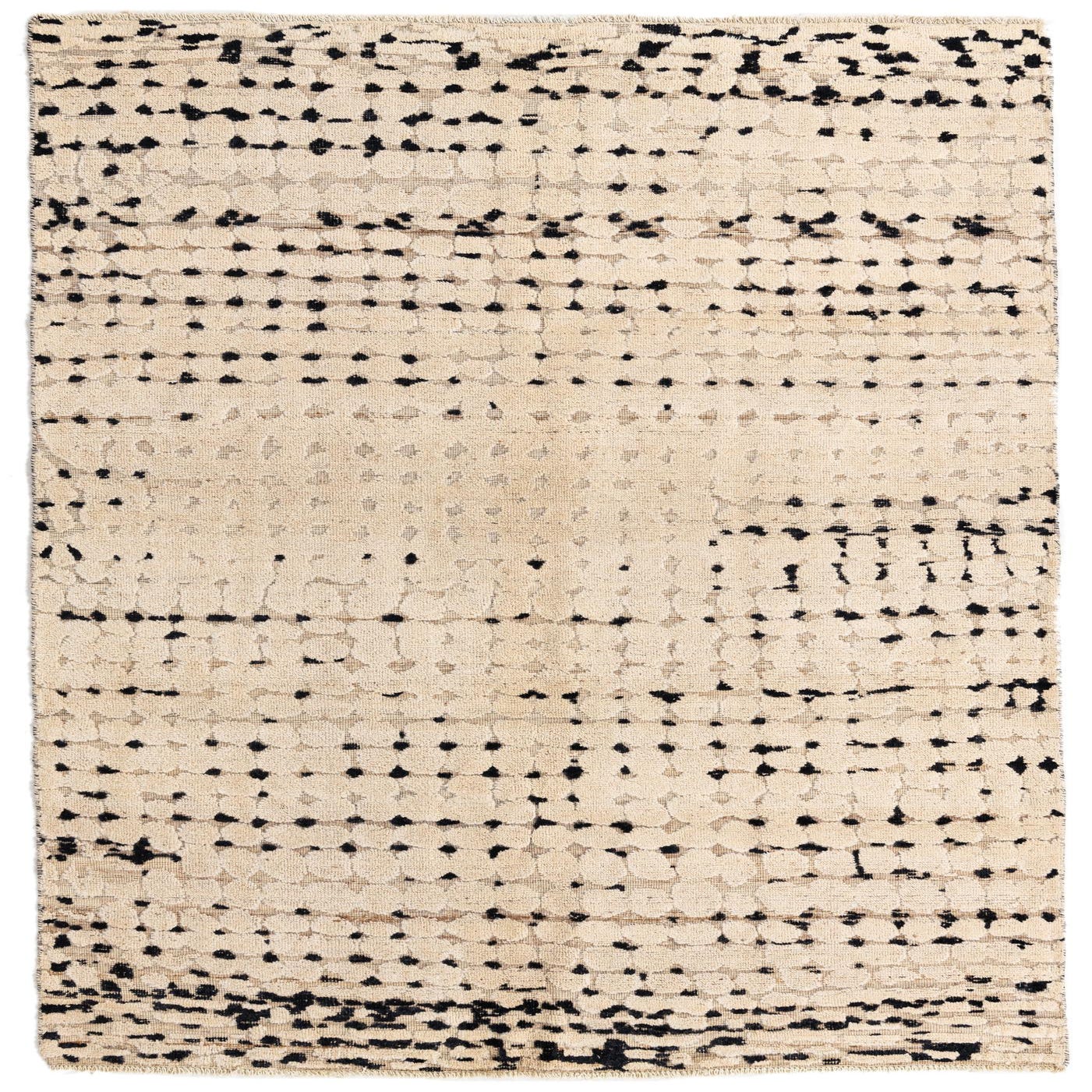 This Moroccan collection rug is a hand-knotted piece, meticulously crafted from 100% wool, and spans 5x8 feet. The rug's patterning is evocative of traditional Moroccan designs, featuring an ivory background embellished by irregular black motifs that provide a touch of visual energy and contrast. Its texture is reflective of the high-quality wool used, offering a pleasing tactile surface that would contribute to a warm and inviting atmosphere in any space.