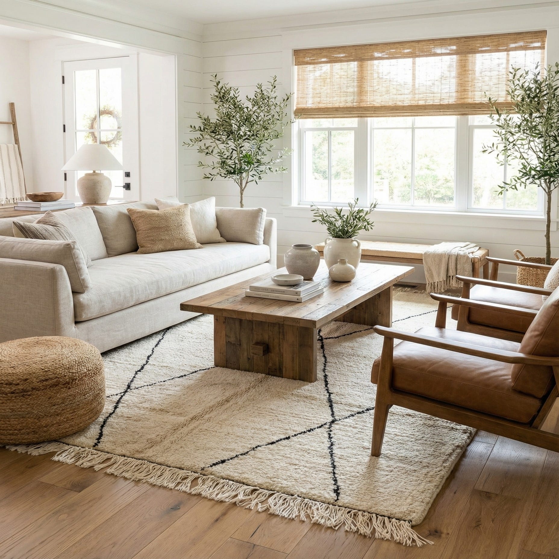A 5x8 rectangular ivory shag rug with a bold black tribal diamond pattern and fringe, suitable for a living room.
