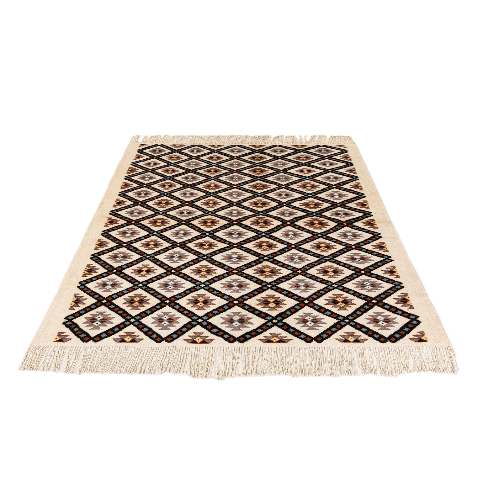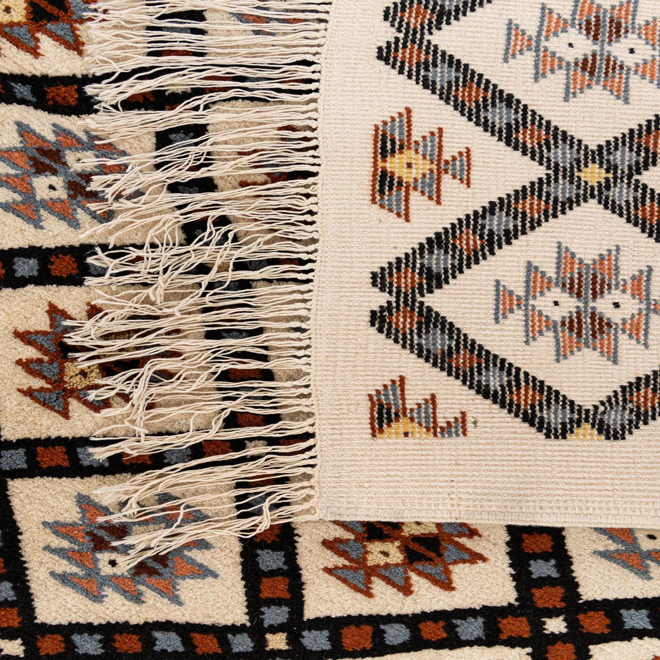 A 5x8 rectangular ivory wool shag rug with a tribal geometric pattern in black, blue, and brown diamonds.