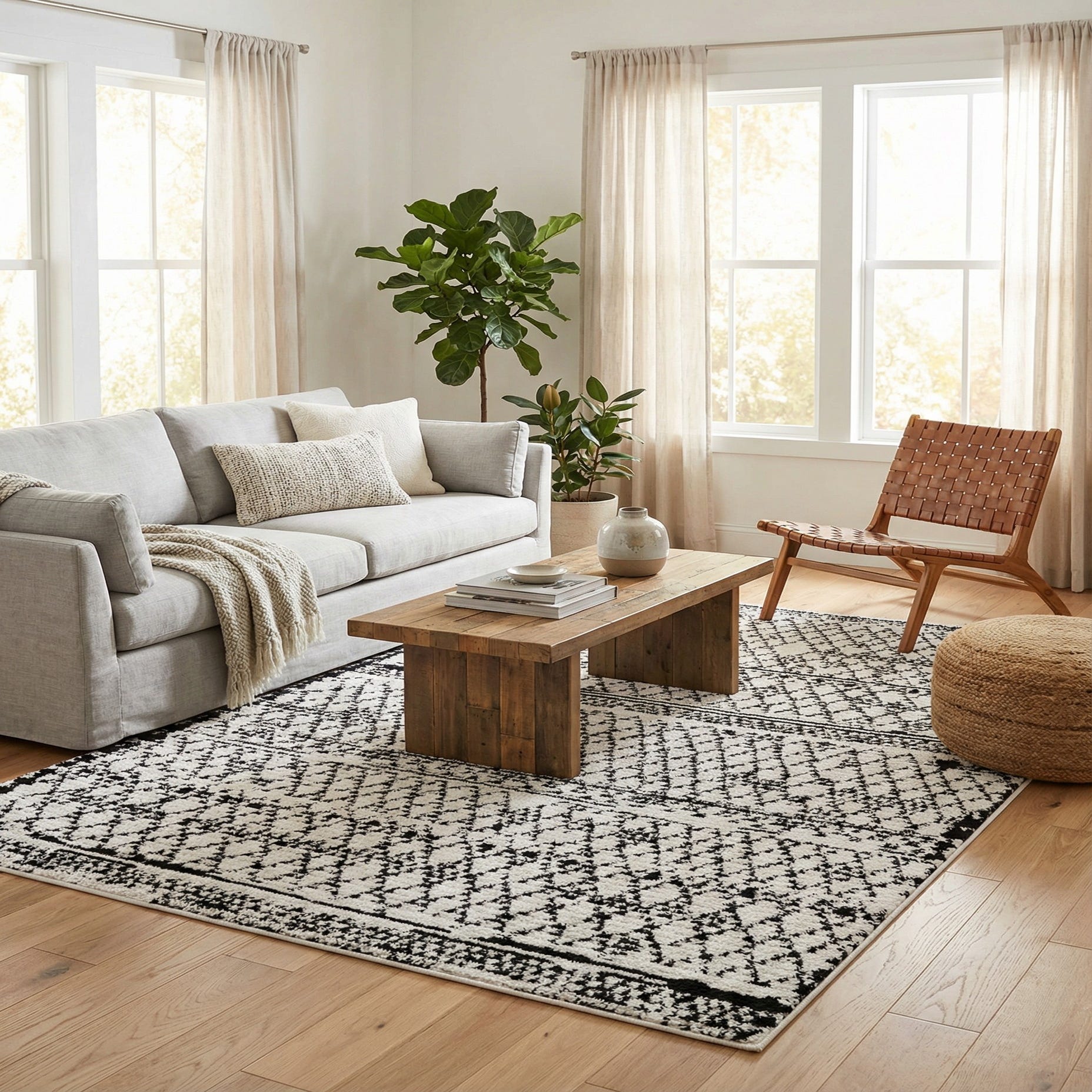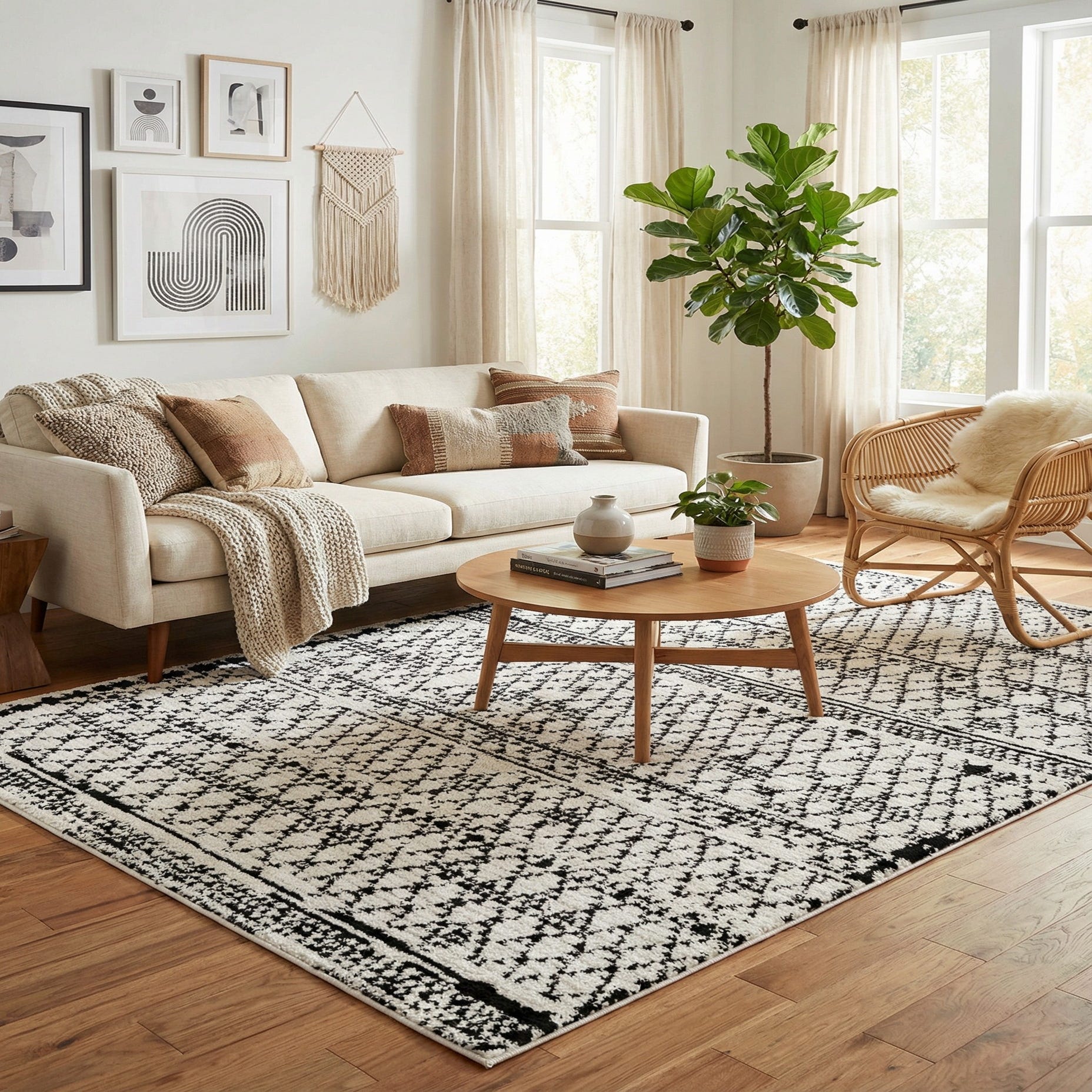 This rug works well to define a living room seating area beneath a sofa and coffee table, to layer at the foot of a bed for added warmth, or to anchor a home office with clean, contrasting lines. It pairs naturally with light wood furniture, black metal accents, and neutral textiles for a contemporary, relaxed aesthetic, and also complements eclectic or boho arrangements where pattern and texture are key.