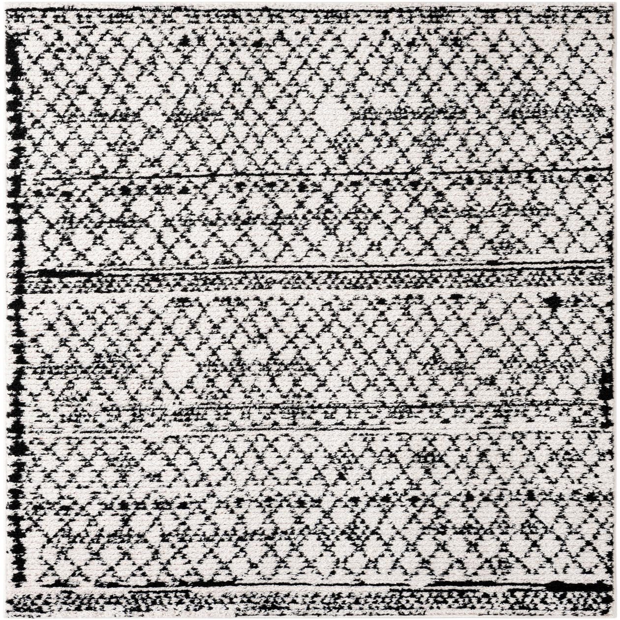 An ivory field provides a soft, neutral backdrop for a bold black geometric motif of small diamond lattices and irregular horizontal bands. The pattern has a hand-drawn, slightly distressed quality that adds visual interest and a layered look. Machine-made from 100% polyester, the pile feels soft and cushiony underfoot with a low-to-medium height and a subtle high-low texture that gives the surface depth without bulk.