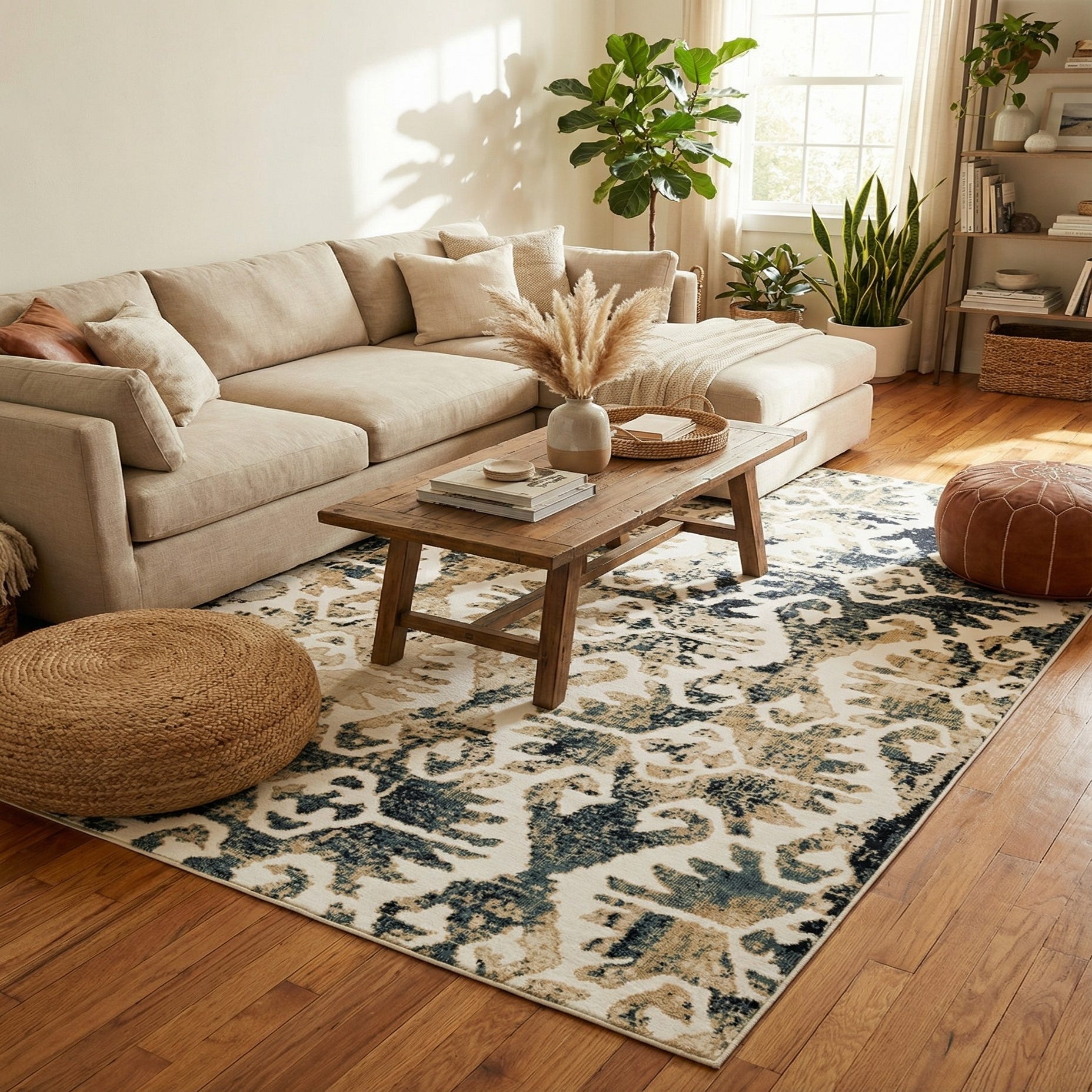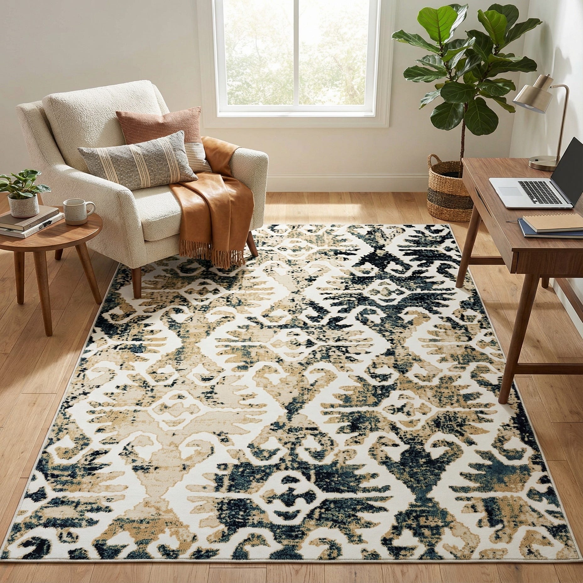 A 5x8 rectangular ivory and cream modern abstract rug with distressed dark blue and beige patterns.