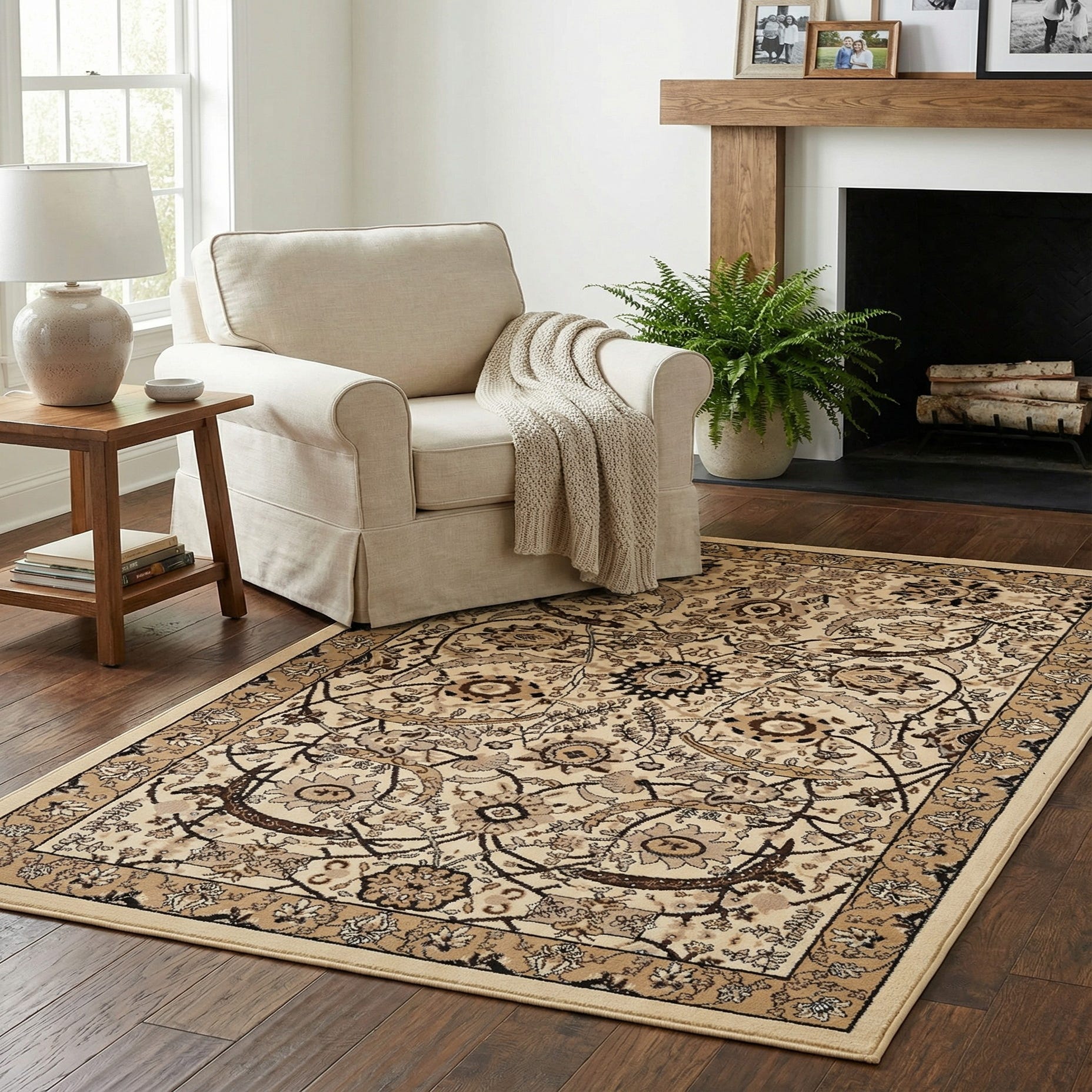 An elegant traditional pattern rests on an ivory ground, where scrolling floral vines and an ornate central medallion unfold in layers of beige, cream, tan, brown and black. The detailed border frames the field with small floral motifs and a warm beige band that adds structure without overwhelming the design. The motif reads classic and balanced, with darker brown and black accents that define the petals and scrollwork against the soft, neutral background.