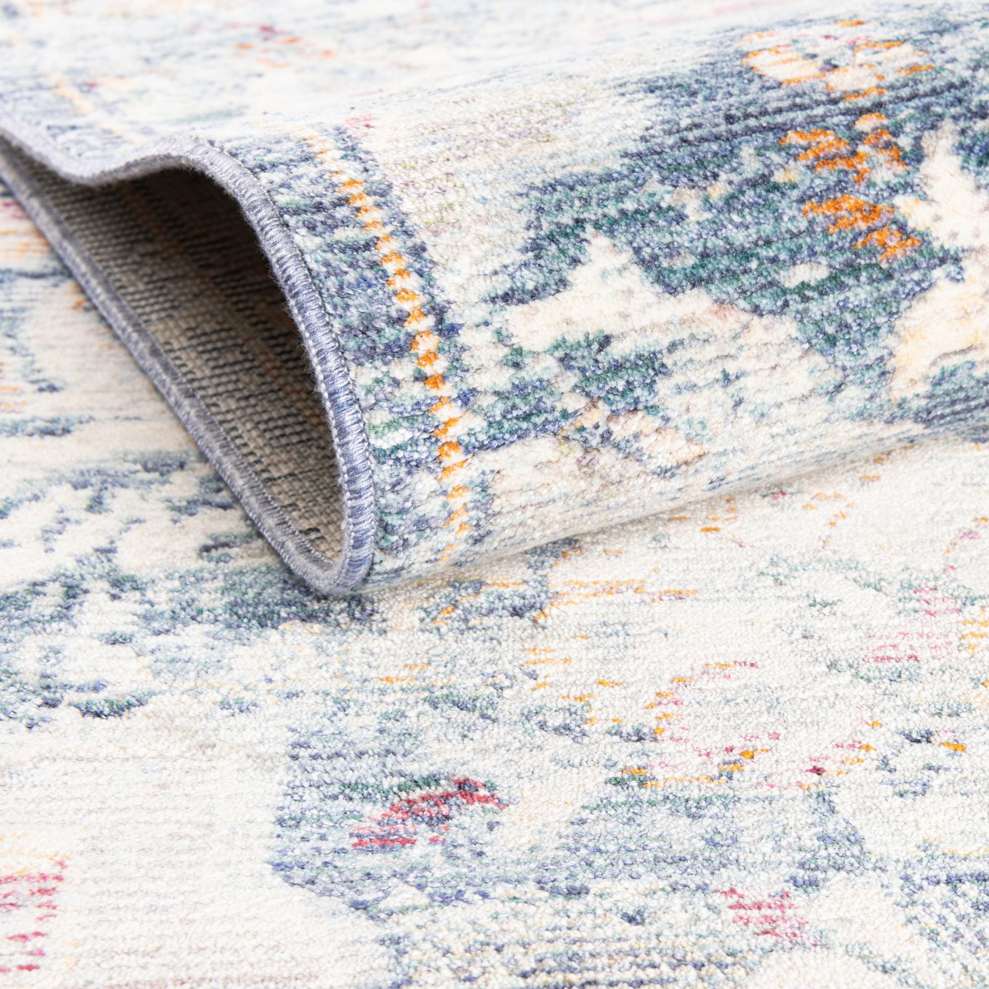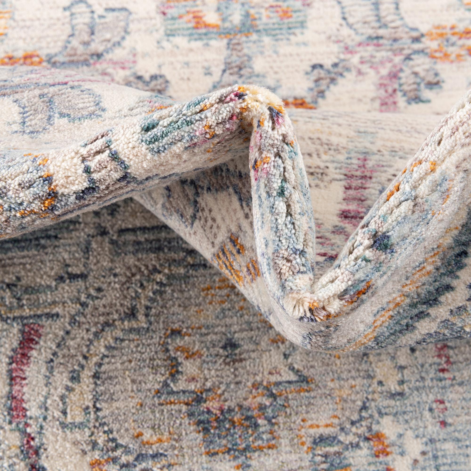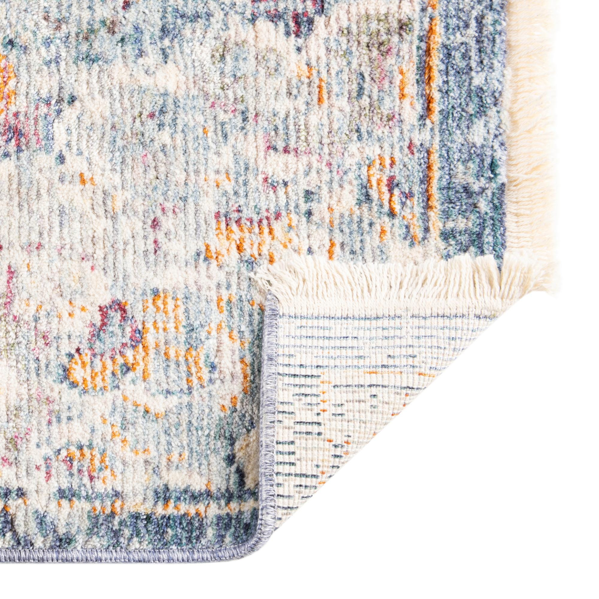 Primary color is Ivory. Colors in this rug include: Ivory, Blue, Yellow, Orange, Pink, Light Blue.