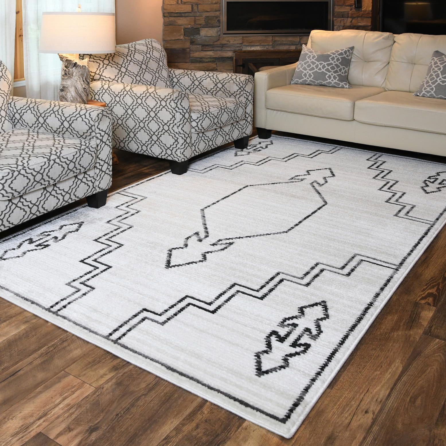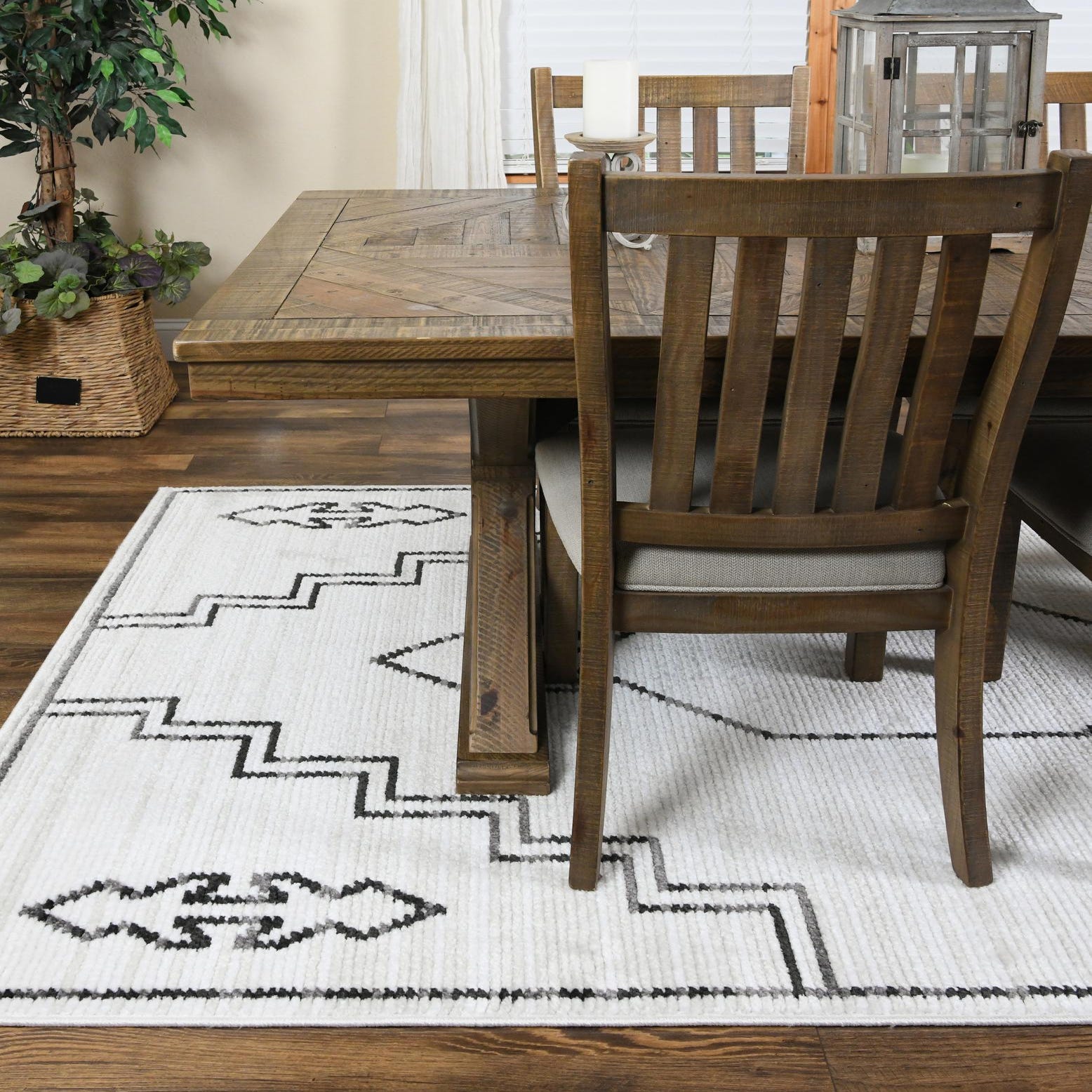 A 5x8 rectangular ivory area rug with a black traditional medallion and geometric pattern, ideal for a living room.