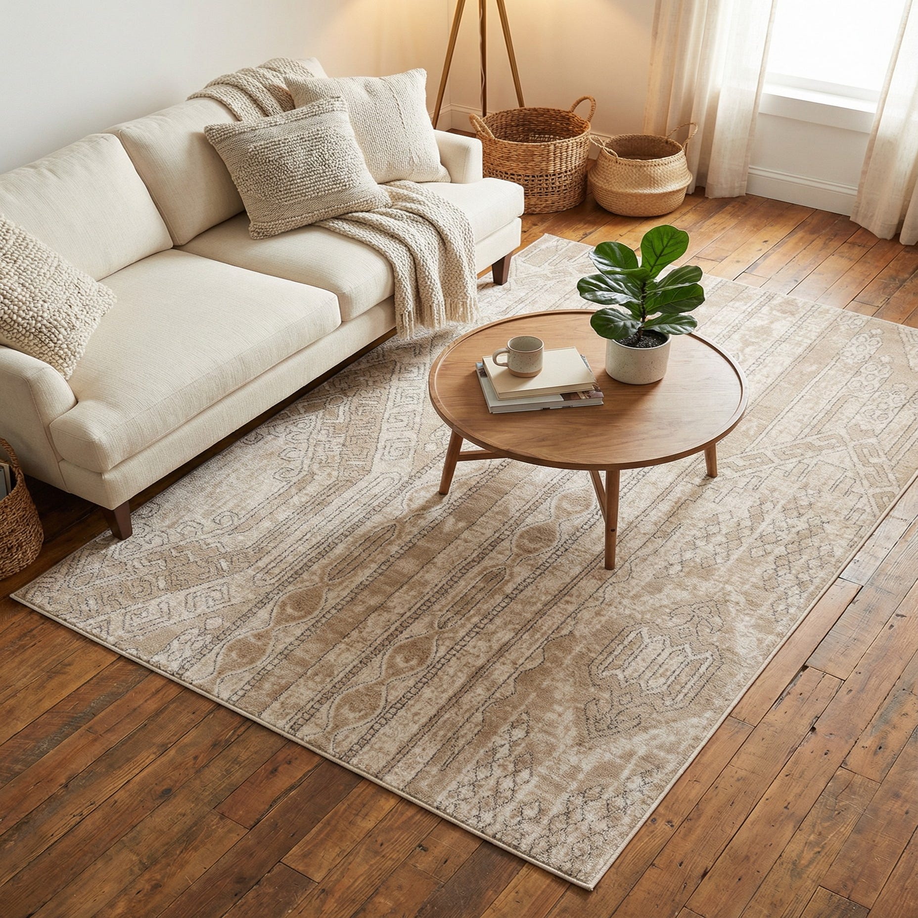 This rug works well where a restrained, layered look is desired: place it under a light-wood coffee table in a living room, beneath a bed with linen bedding, or in a home office to soften hard floors. Its neutral ivory-and-gray palette pairs naturally with natural textures, muted blues or greens, and mixed-metal accents for a contemporary farmhouse or relaxed Scandinavian interior. The linear elements also help elongate narrow spaces, making it a good choice for hallways and entryways.