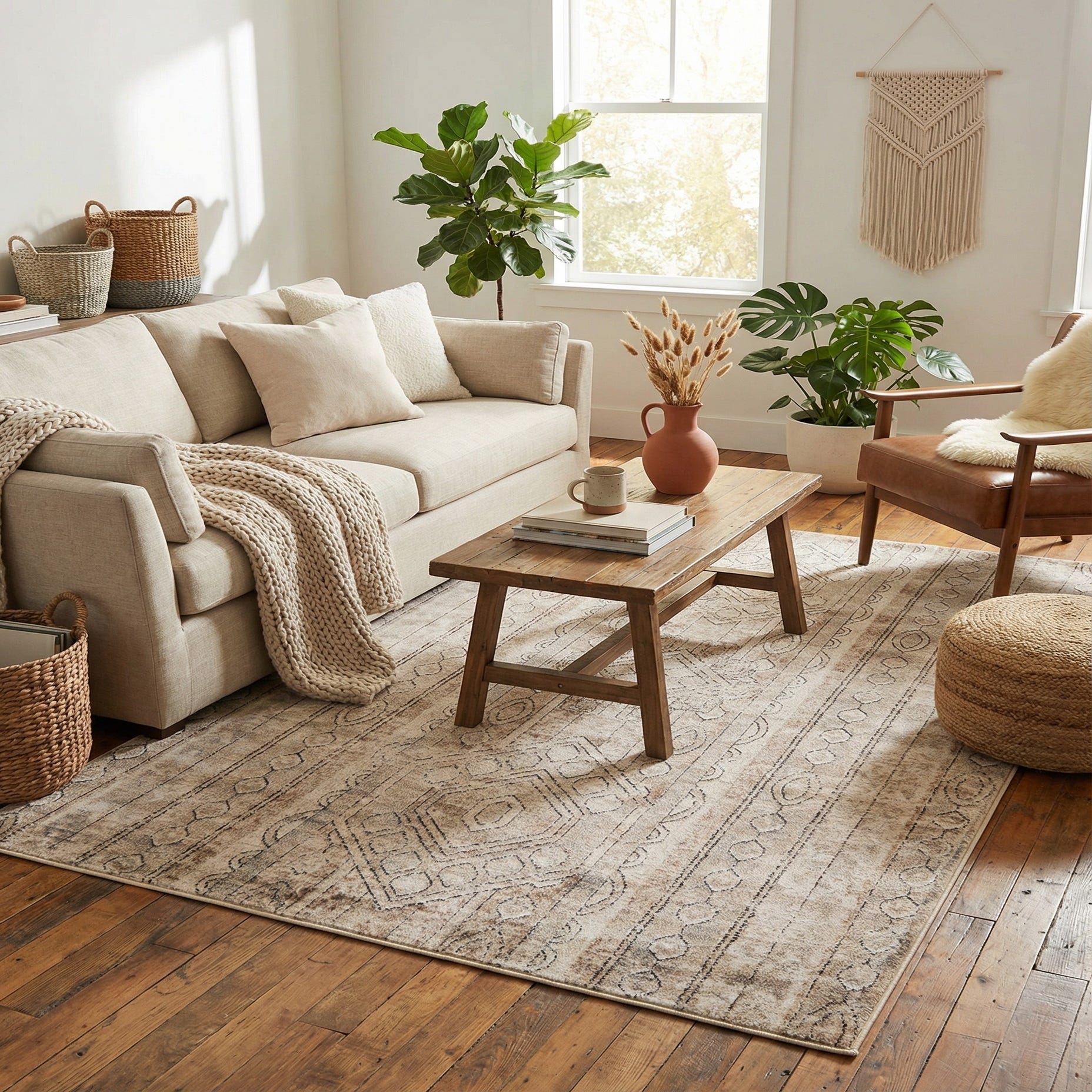 Machine made from 85% polypropylene and 15% polyester, this rug offers dependable structure and a comfortable feel underfoot. Its neutral palette and transitional aesthetic pair well with modern farmhouse, Scandinavian, or contemporary interiors—try it with warm wood furniture and linen upholstery to highlight the light brown tones, or with cool metal accents and gray textiles to echo the gray detailing. It works well anchoring a seating area, layering in a bedroom to soften hard floors, or defining a casual dining or entry space.