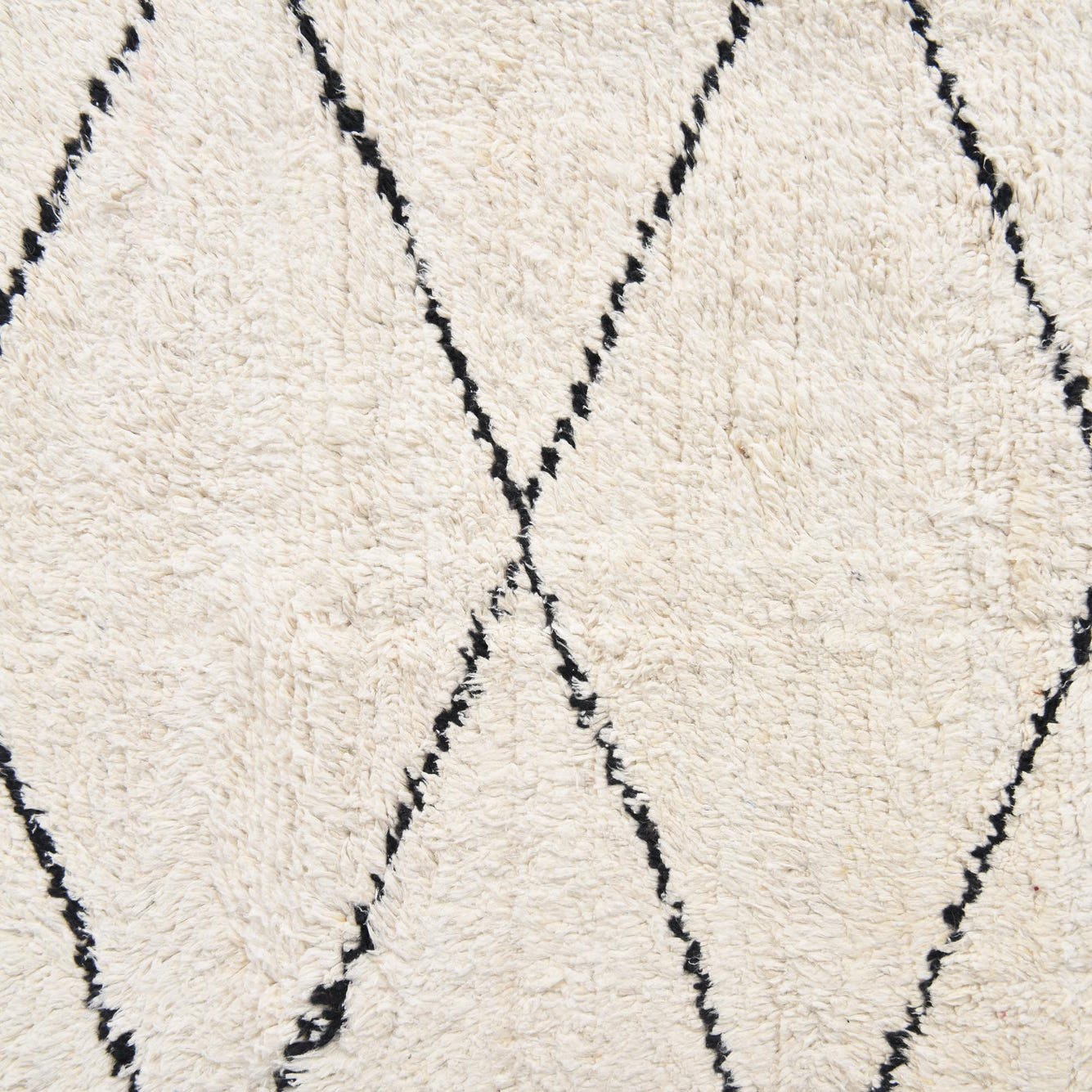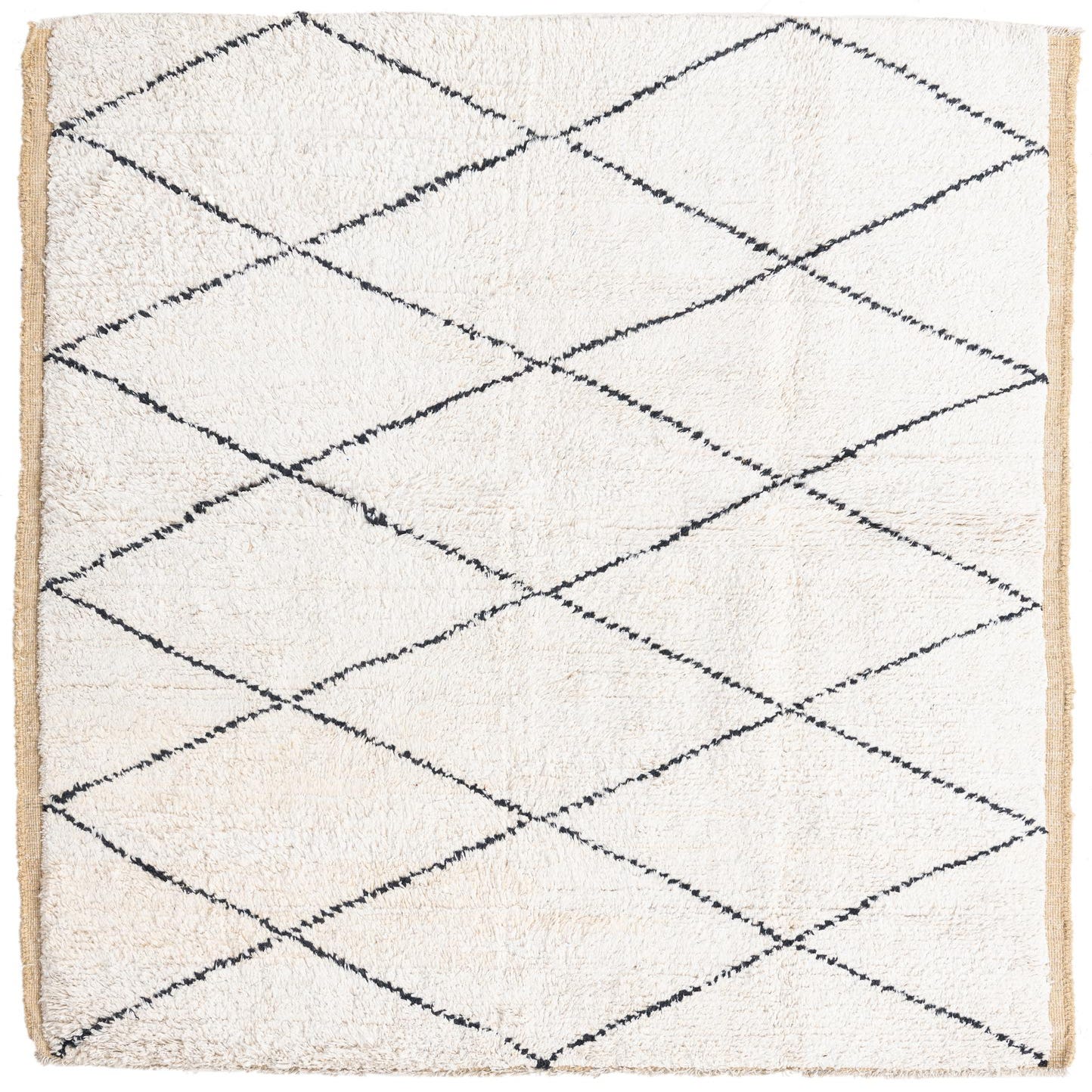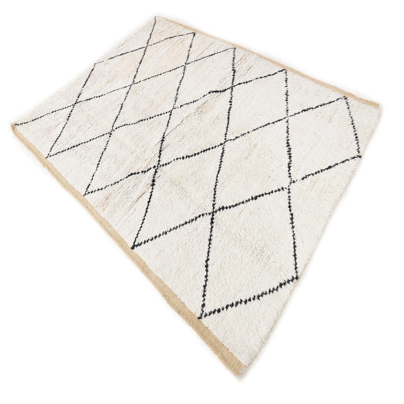 A 5x8 rectangular ivory wool rug with a modern black diamond pattern and textured pile, suitable for a living room.