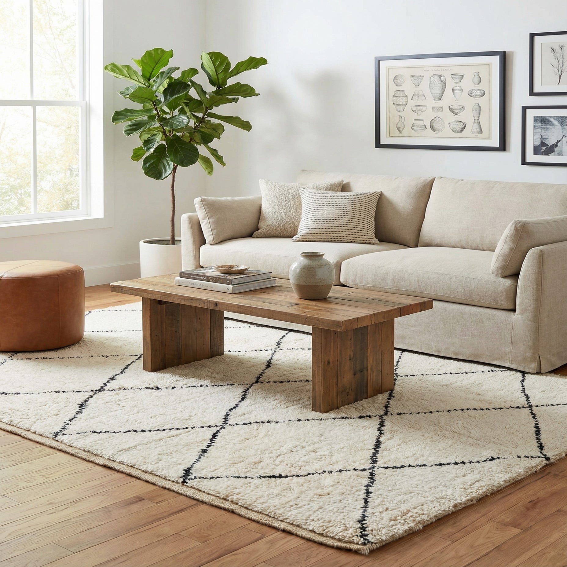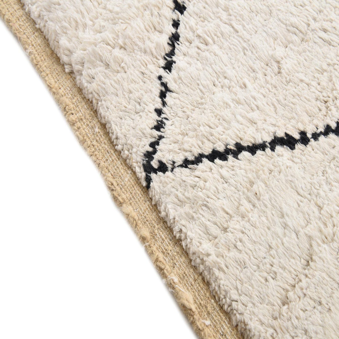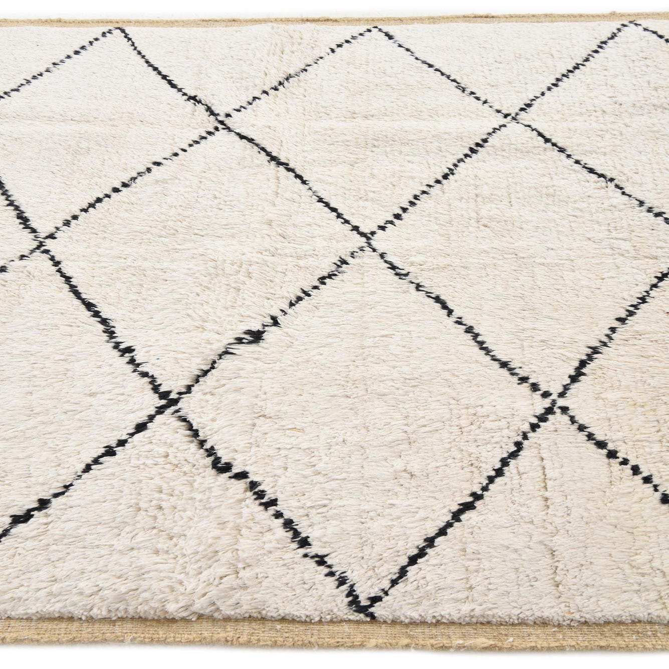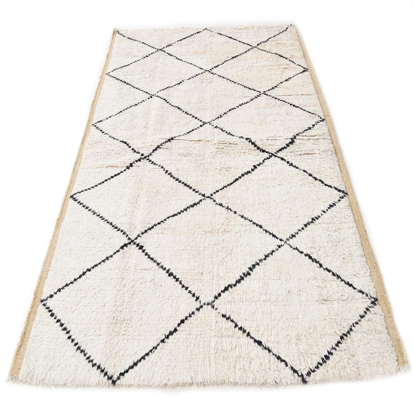 A 5x8 rectangular ivory wool rug with a modern black diamond pattern and textured pile, suitable for a living room.