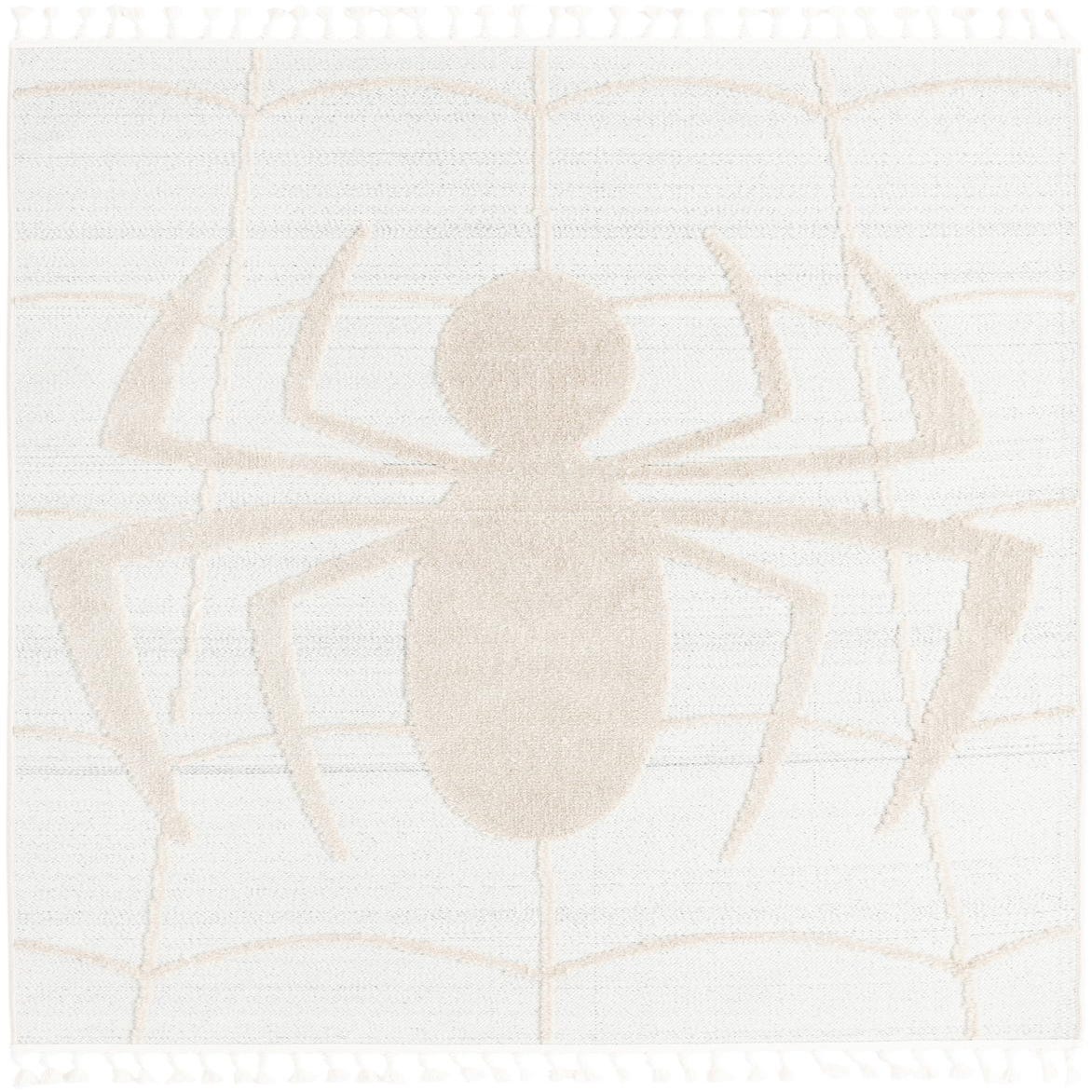 A 5x8 rectangular ivory and white modern rug featuring a large spider and web pattern, suitable for indoor or outdoor use.