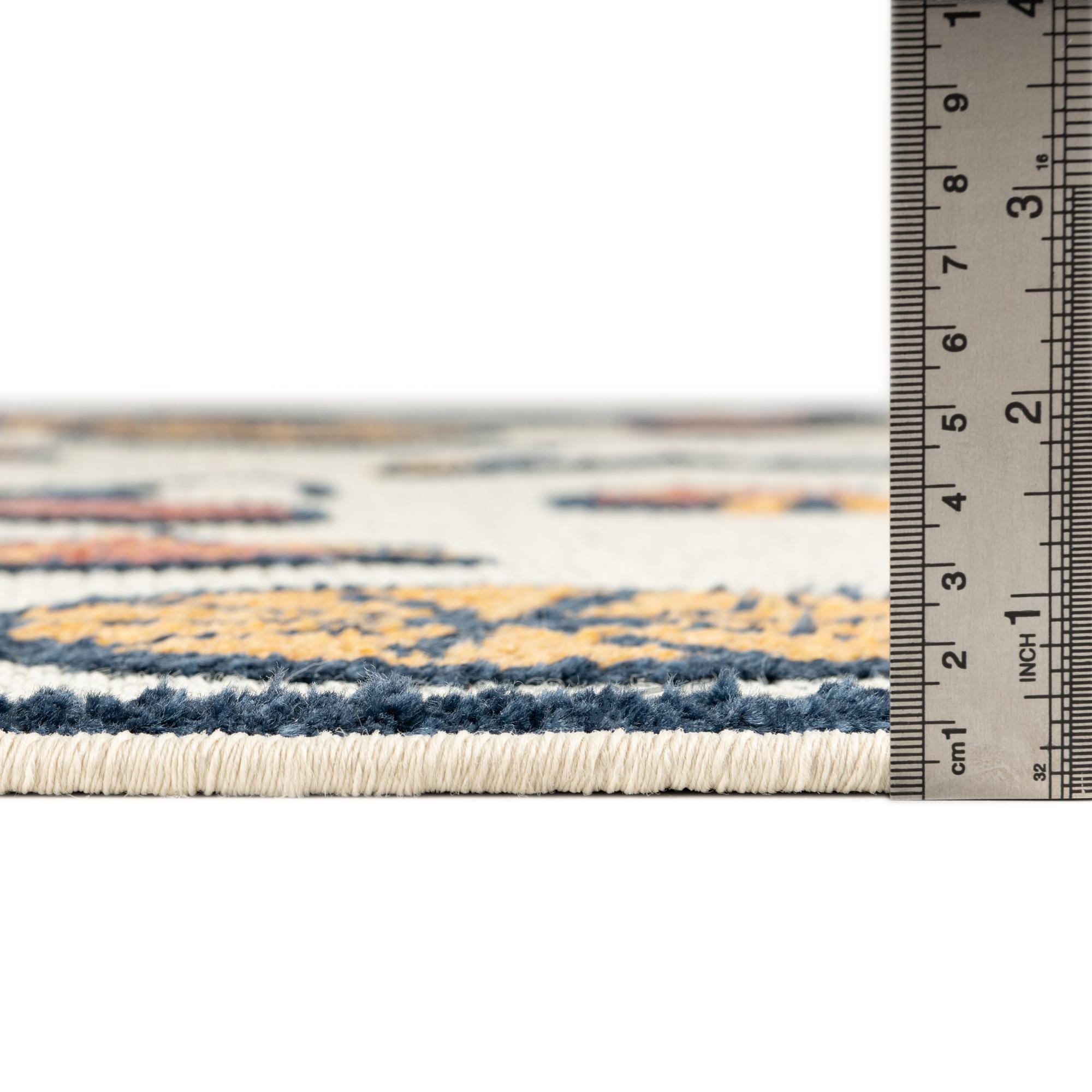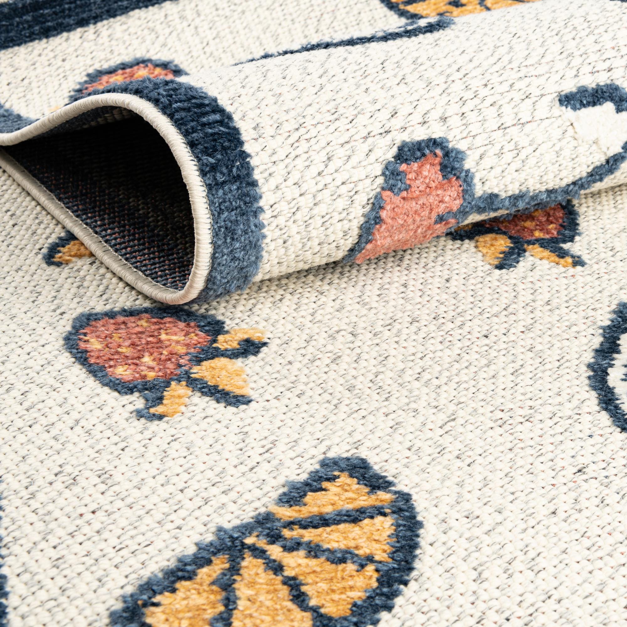 Primary color is Ivory. Colors in this rug include: Ivory, Navy Blue, Yellow, Terracotta.