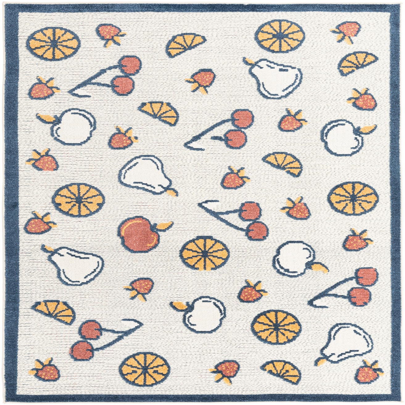 A 5x8 rectangular ivory rug with a playful, modern fruit pattern including oranges, cherries, apples, pears, and strawberries, bordered in navy blue.