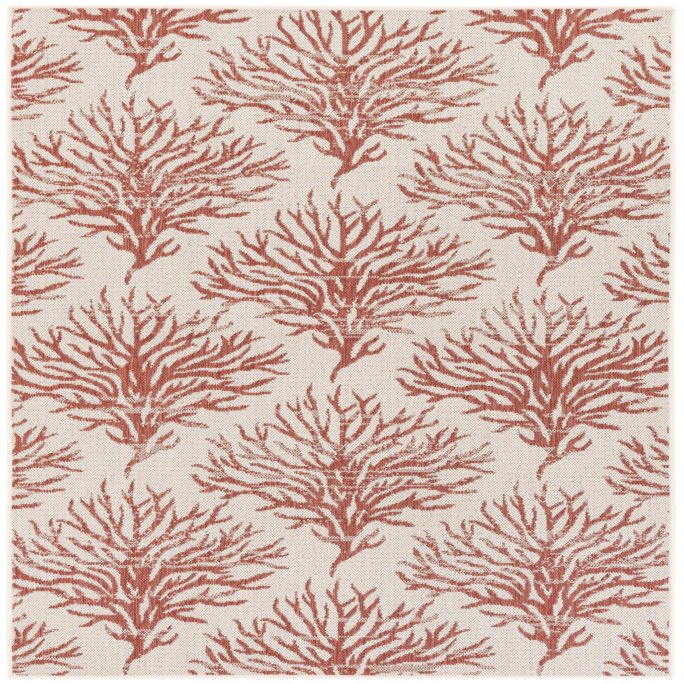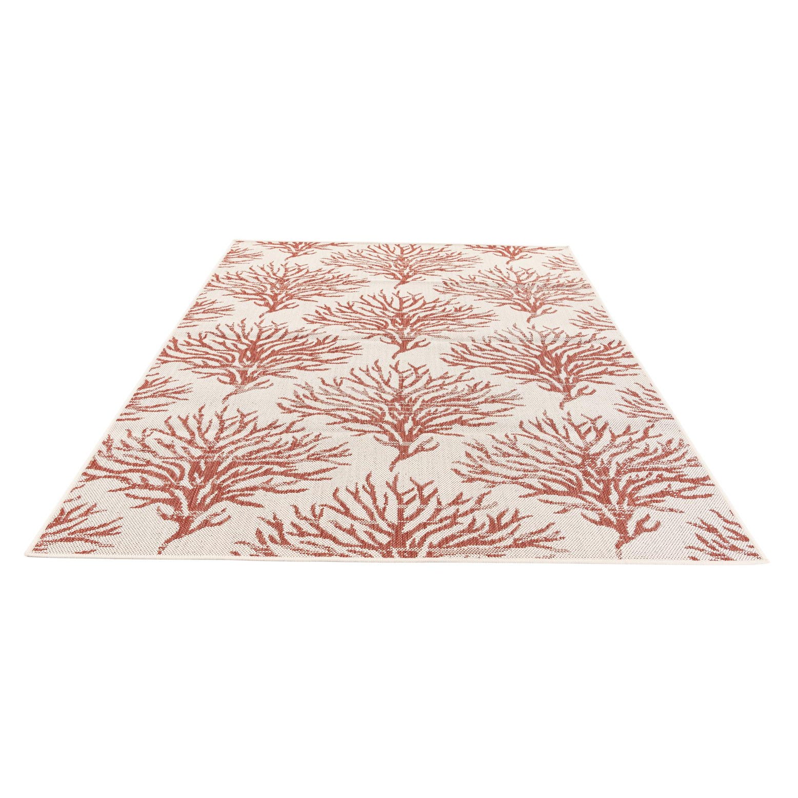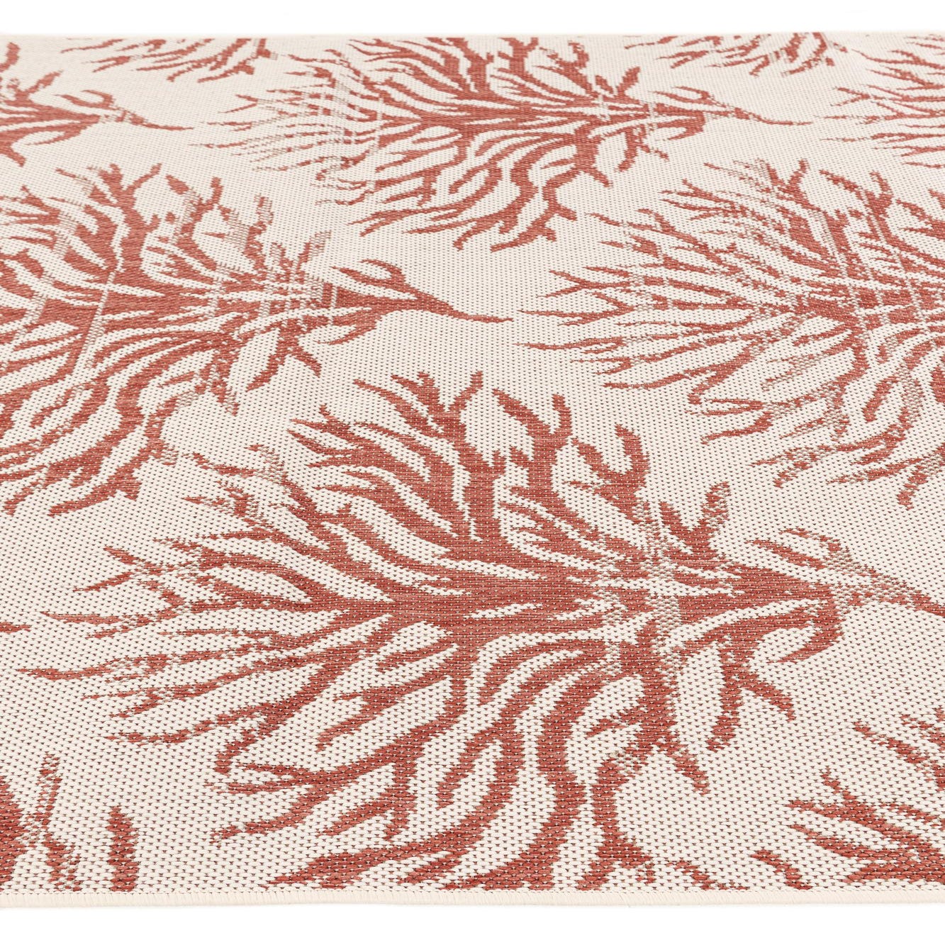 A 5x8 rectangular ivory rug with a repeating modern coral pattern in terracotta red, suitable for indoor/outdoor spaces.