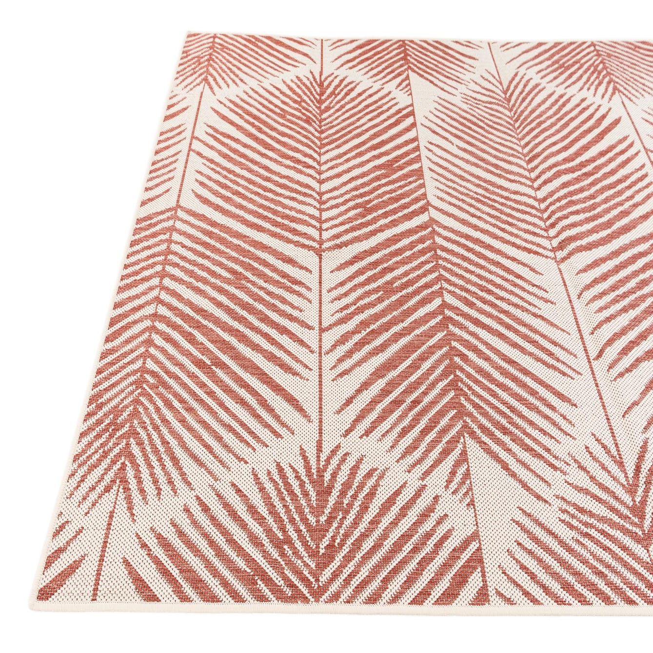 A 5x8 rectangular indoor/outdoor rug featuring a modern botanical pattern of terracotta palm fronds on an ivory background.