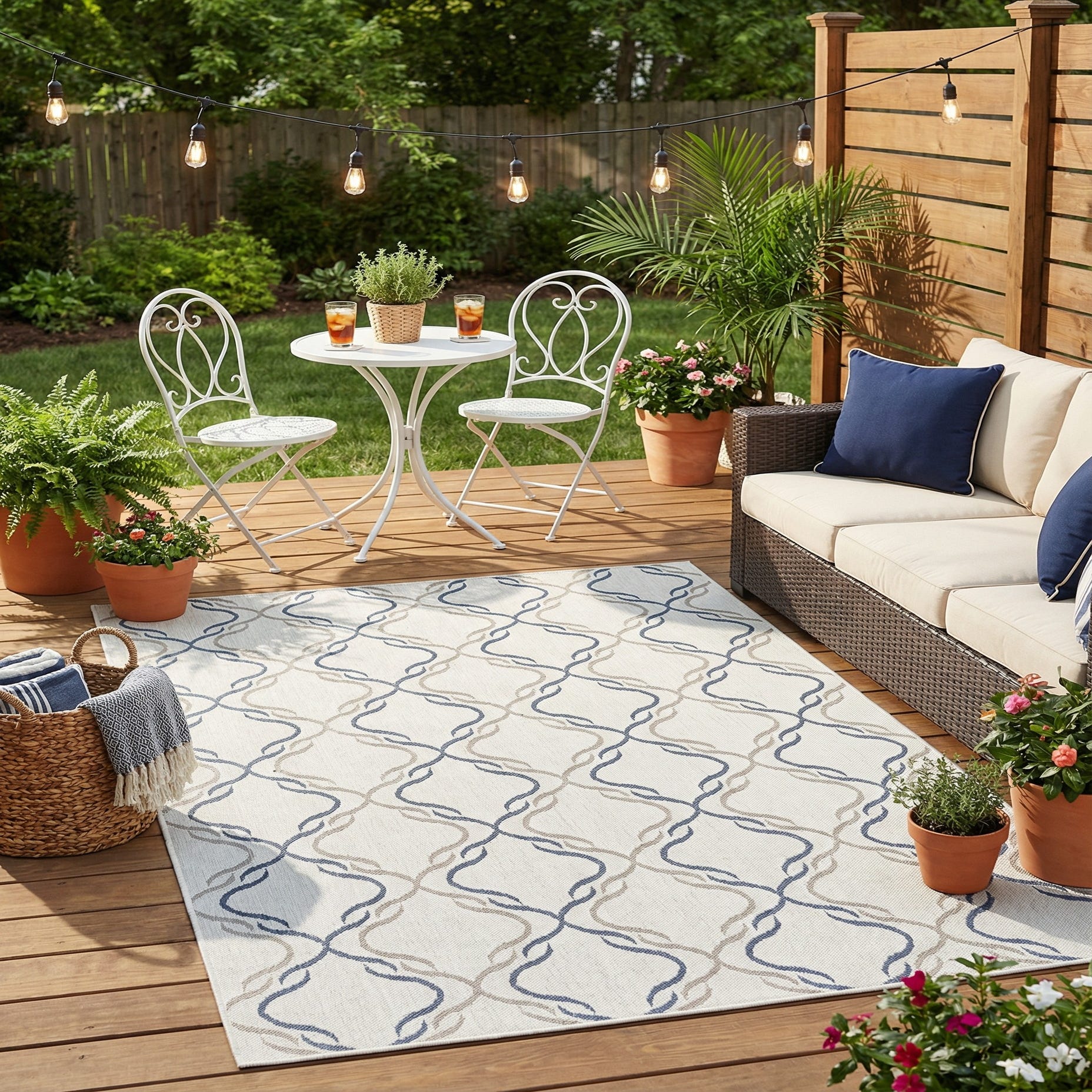 The Outdoor Lattice collection offers a 5x8 area rug that incorporates a modern take on traditional lattice patterns. This machine-woven polypropylene piece showcases a series of interconnected loops in a trio of harmonious colors: ivory, which serves as a neutral background, is complemented by graceful lines in soothing shades of blue and gray. The flatweave construction provides a smooth texture that is both stain-resistant and shed-free, making this rug an ideal choice for high-traffic areas.