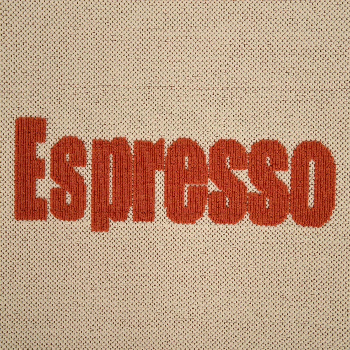 A 5x8 rectangular ivory rug with modern orange text repeating "Latte-macchiato" and "Espresso" in various orientations, suitable for a kitchen or patio.