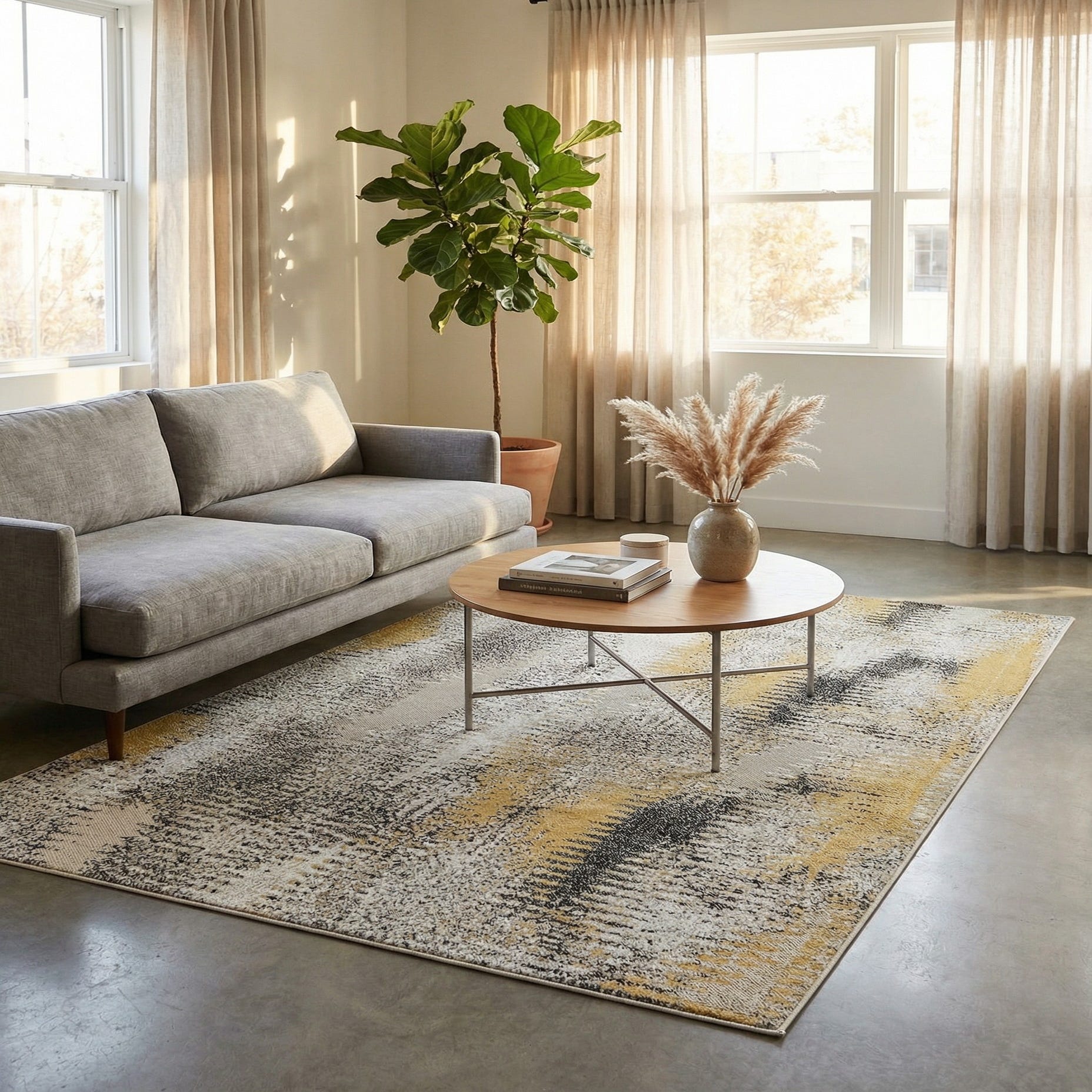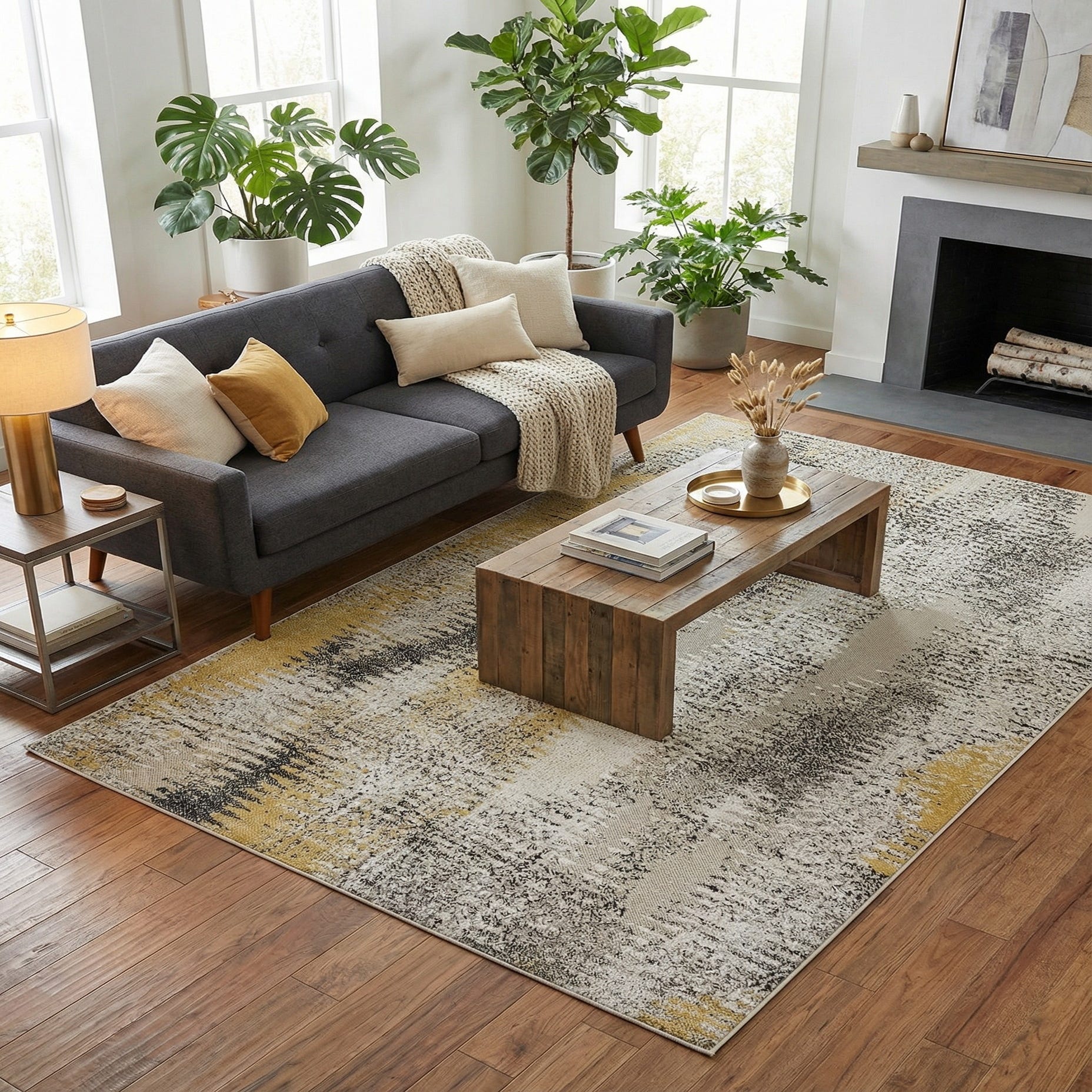 The versatile color palette and modern design make this rug suitable for integrating into a range of decor themes — from minimalist and Scandinavian-inspired spaces to more eclectic and artistic environments. The splash of Yellow adds a dynamic visual component that can complement neutral tones or coordinate with other vibrant accents within a room.