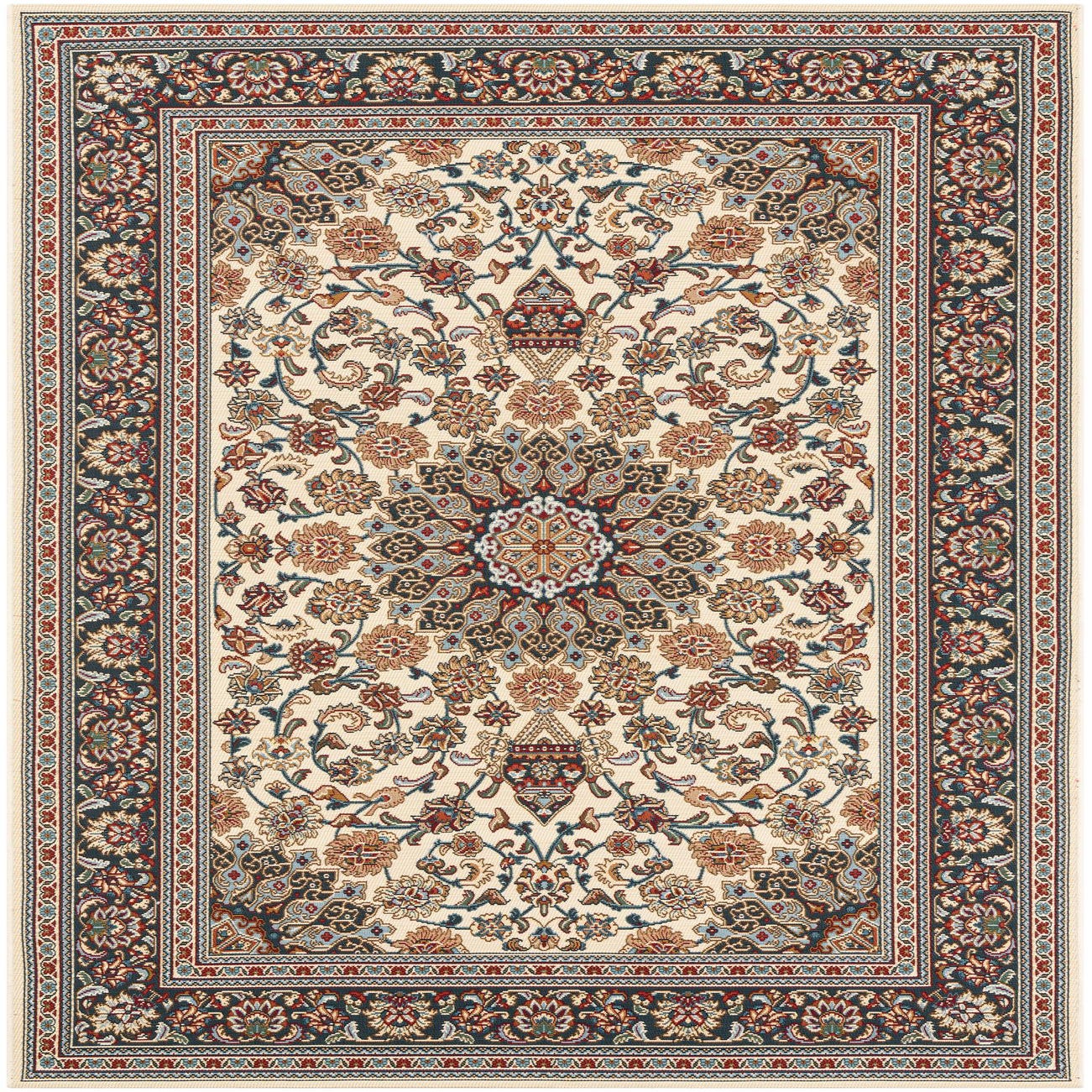 Primary color is Ivory. Colors in this rug include: Ivory, Brown, Navy Blue, Red, Green, Beige, Blue.
