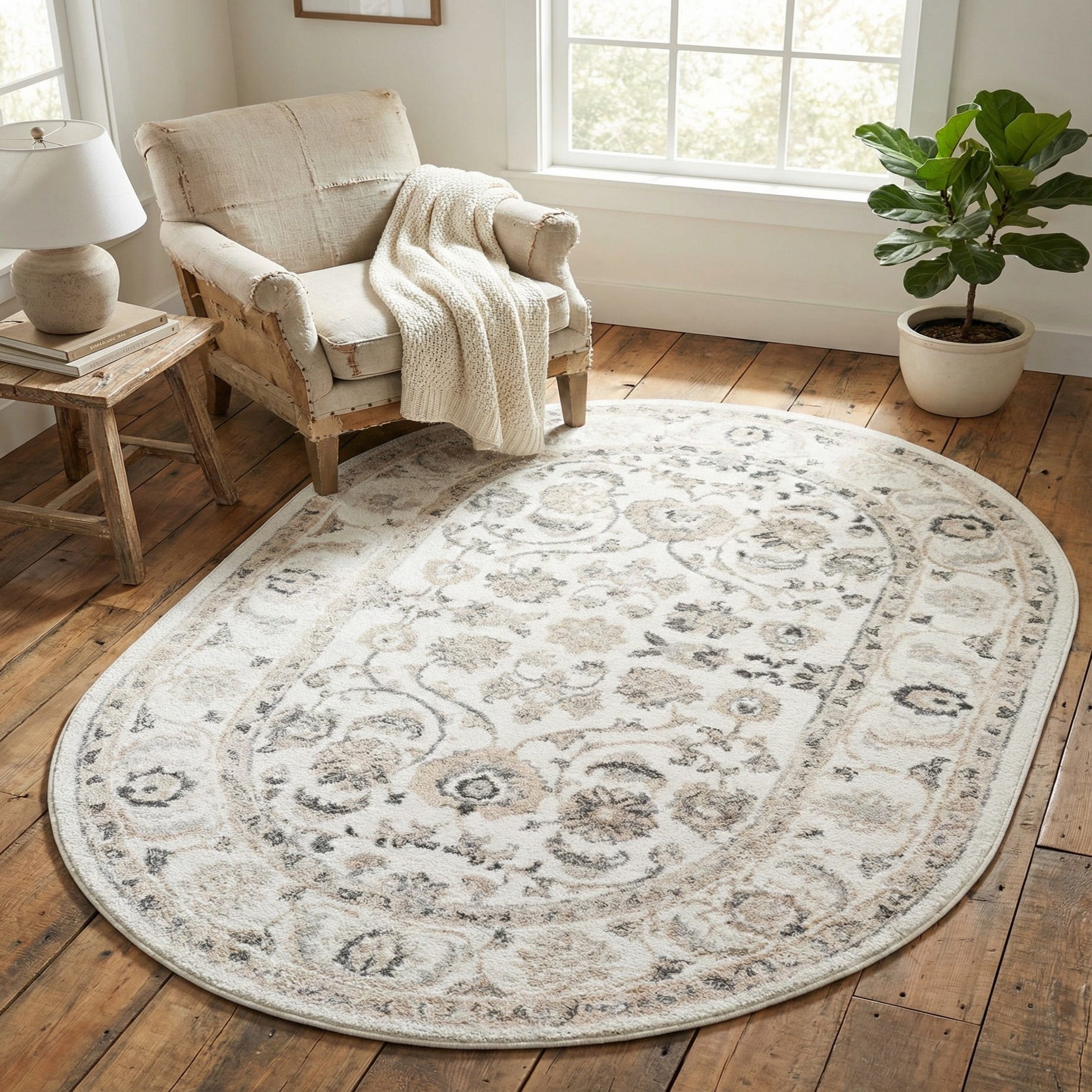 An oval ivory and cream rug with a traditional botanical floral pattern in muted beige and gray tones.