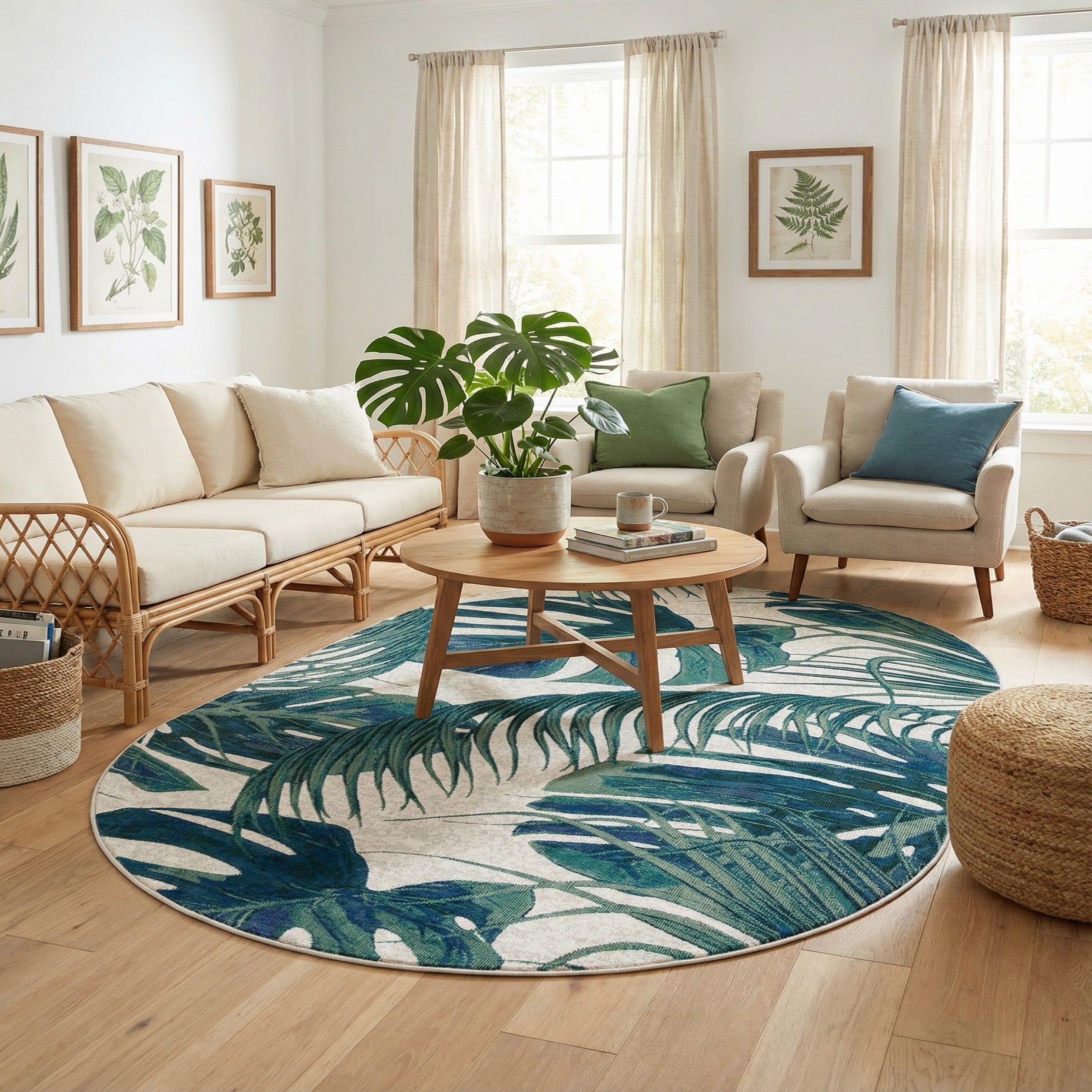 This piece works well beneath a round dining table, in a sunroom or entry, or anchored in front of a sofa to bring a botanical touch to a living area. Pair it with rattan or light-wash wood furniture and crisp white linens for a coastal-tropical look, or combine with navy upholstery and black metal accents for a more contemporary scheme. It also layers nicely over a neutral floor to introduce pattern and color without overwhelming the space.