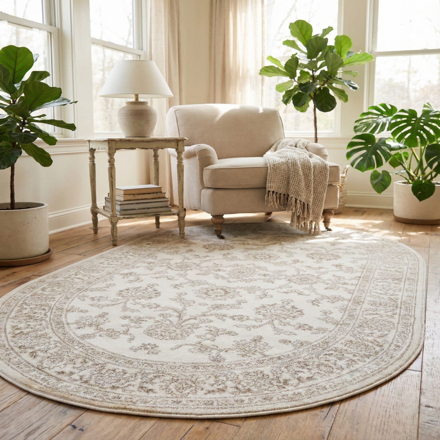 Machine-made from 100% polypropylene, the rug has a low, smooth pile that feels soft underfoot while maintaining a structured, even surface. The oval shape is ideal for anchoring a round dining table or defining a cozy seating area, and it layers nicely at the foot of a bed or in an entryway. It complements warm wood floors, painted furniture in muted hues, linen upholstery, and mixed-metal accents—suiting traditional, transitional, cottage, or lightly modern interiors that favor a calm, neutral palette.