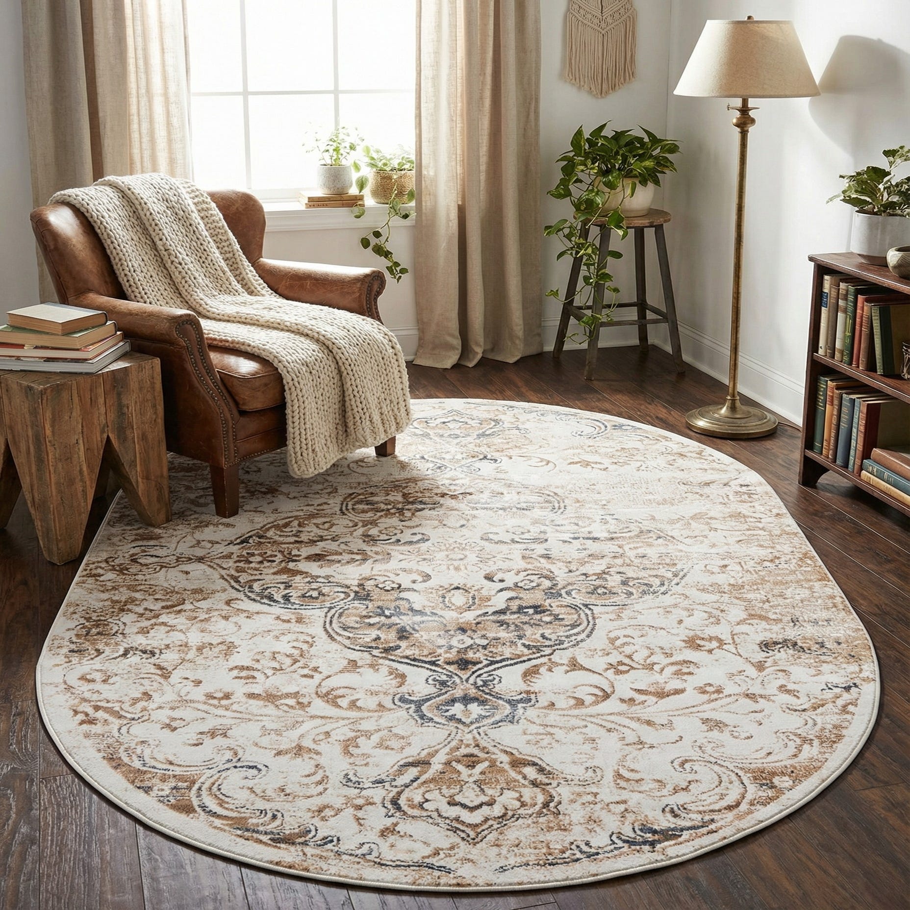 The Highbury collection offers a machine-woven 5x8 oval rug that presents a blend of durability and sophisticated design. Crafted from 60% Polypropylene and 40% Polyester, this piece boasts a balance between resilience and a soft touch. The rug exhibits an ornate pattern with intricate flourishes and botanical motifs that exude a timeless elegance. Its color palette features a harmonious combination of ivory, gray, and light brown accents set against a creamy ivory background, lending a sense of warmth and neutrality that can integrate smoothly into various decor styles.