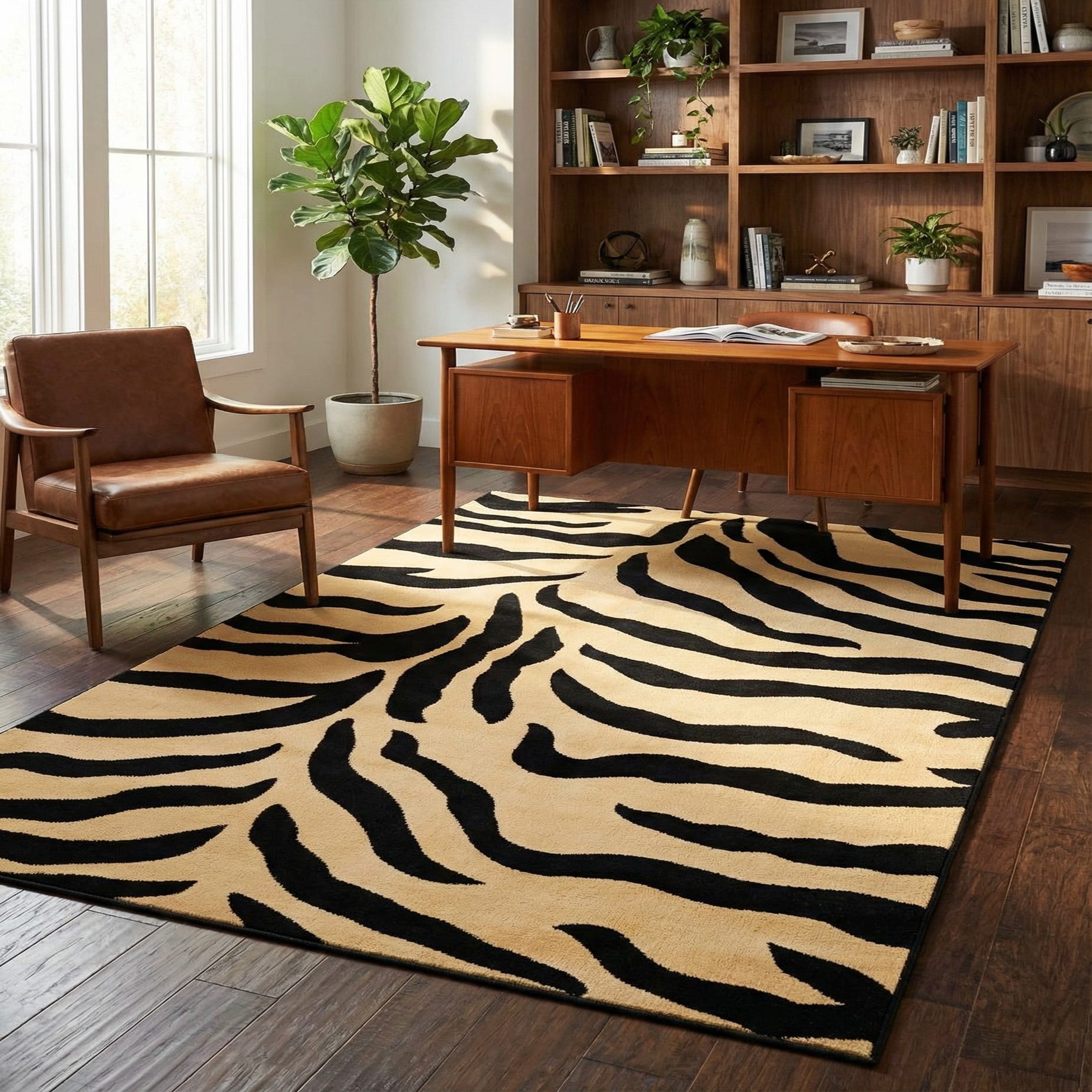 A bold, graphic animal-stripe pattern in deep black cuts across a warm ivory field, creating a strong visual rhythm that brings energy to the floor. The organic, flowing stripes feel deliberate yet natural, giving the rug a modern, contemporary edge with an unmistakable personality. Machine-made from 100% polypropylene, the surface has a dense, low-pile finish that feels smooth and slightly cushioned beneath your feet while keeping the pattern edges sharp and defined.