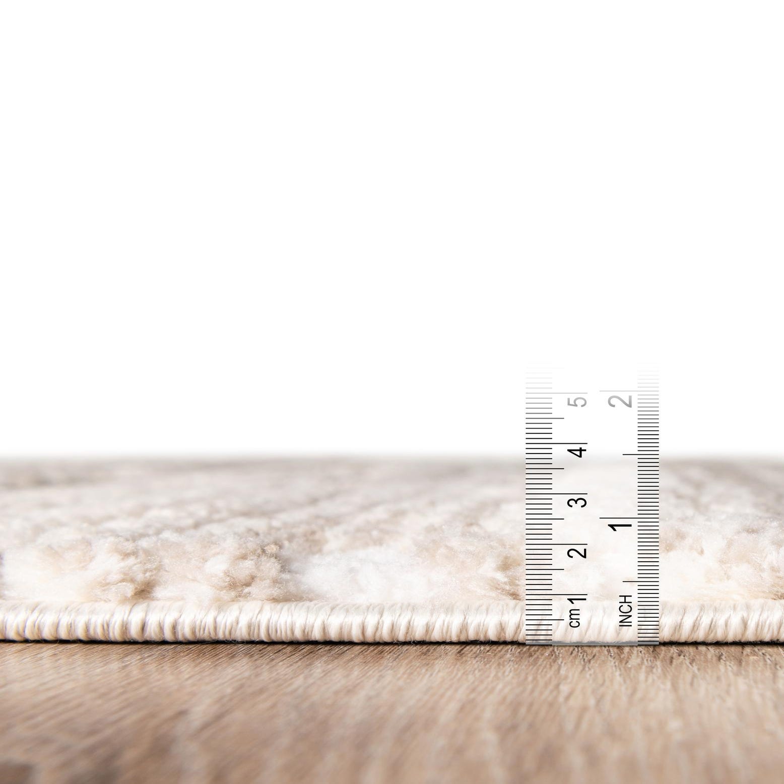 A field of soft ivory provides a calm backdrop for an abstract linear pattern in warm gray and cream. Horizontal striations move across the surface in varied widths, creating a modern, low-contrast motif that reads contemporary yet relaxed. The rug is machine-made from polypropylene and polyester and has a plush, cut-pile feel with gentle high-low texture—run your hand across it and you’ll notice a slightly cushioned softness and subtle sheen where the fibers catch the light.