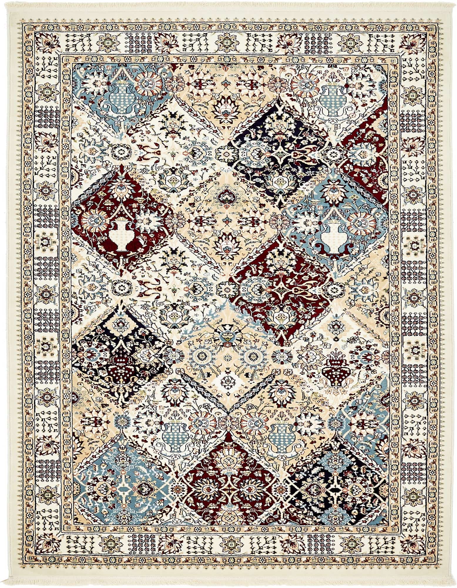 Primary color is Ivory. Colors in this rug include: Ivory, Black, Blue, Burgundy, Cream, Green, Navy Blue, Puce, Tan.