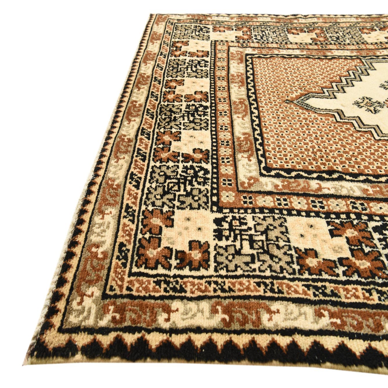 A 5x8 rectangular ivory Persian wool rug with a traditional medallion pattern and intricate borders.