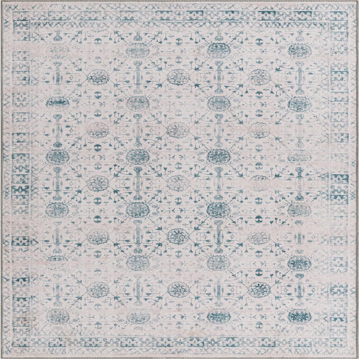 A 5x8 rectangular ivory and teal transitional rug with a distressed floral and geometric oriental pattern.