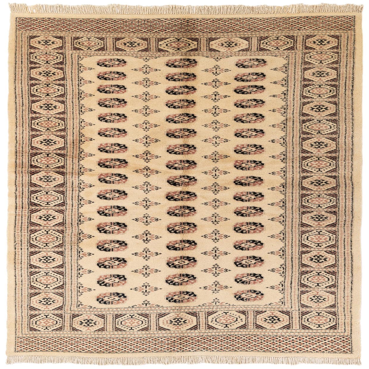 Primary color is Ivory. Colors in this rug include: Ivory, Black, Brown.