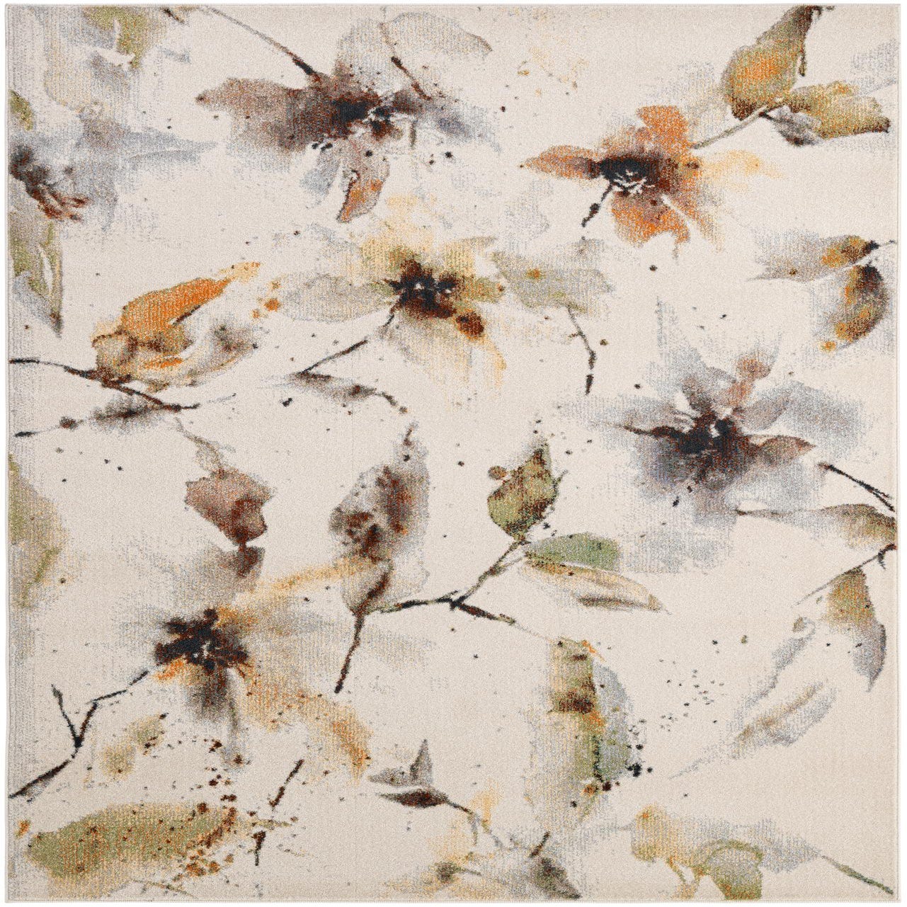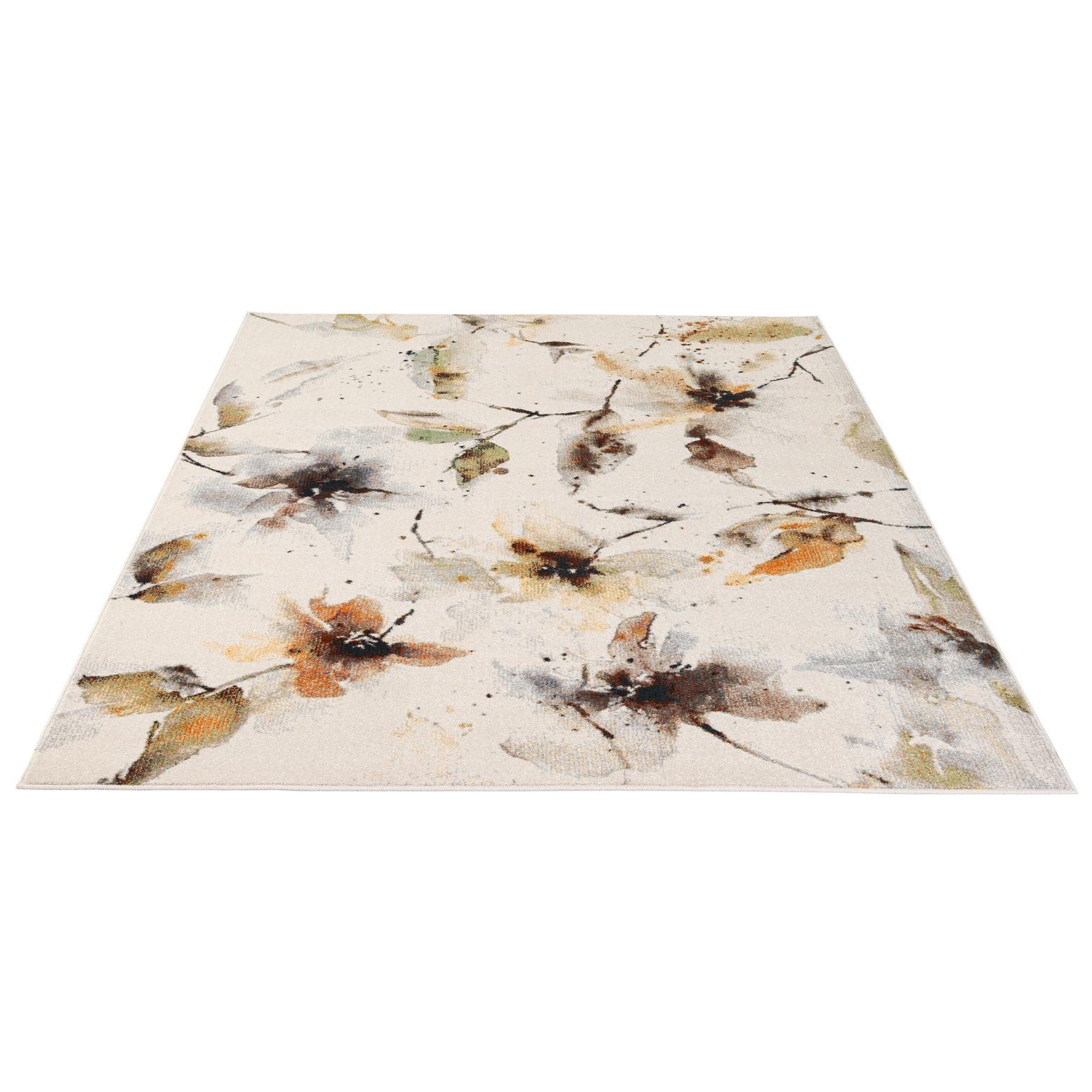 A 5x8 rectangular ivory modern floral rug with watercolor-style blooms in brown, orange, and gray tones.