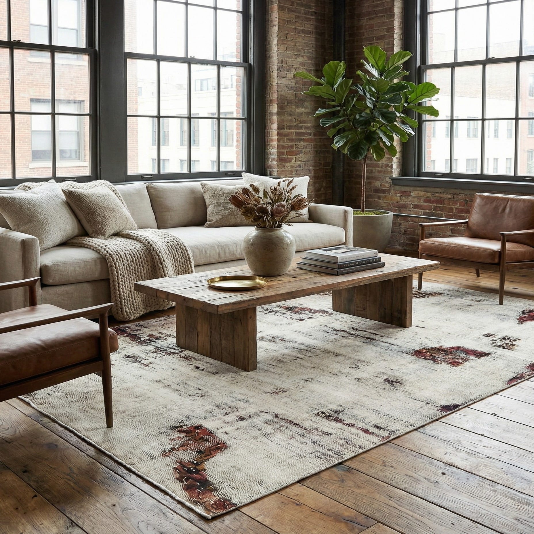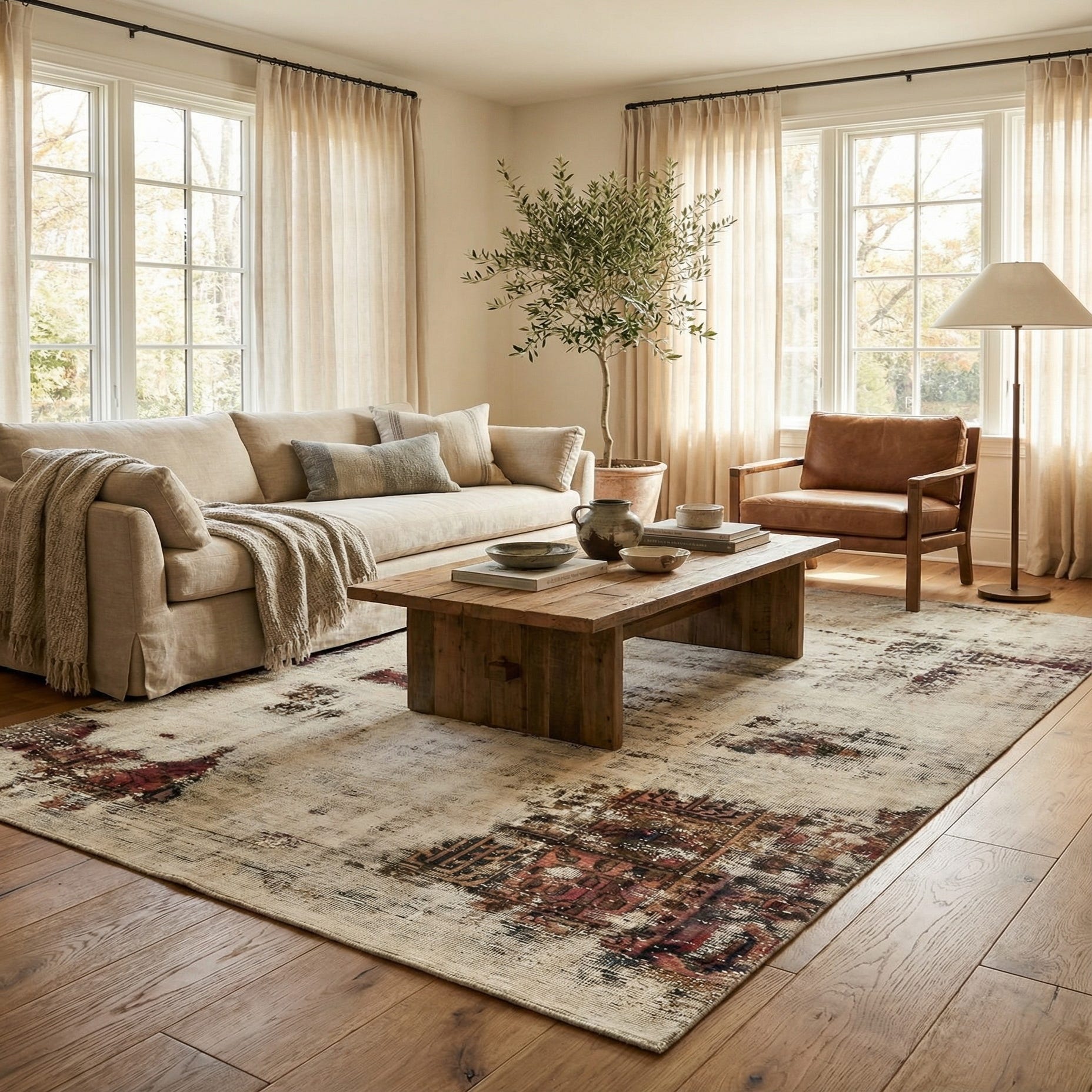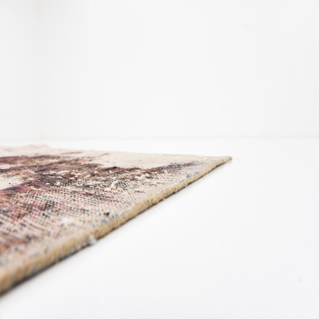 A 5x8 rectangular ivory and cream vintage Persian-style wool rug with distressed abstract patterns in muted reds and browns.
