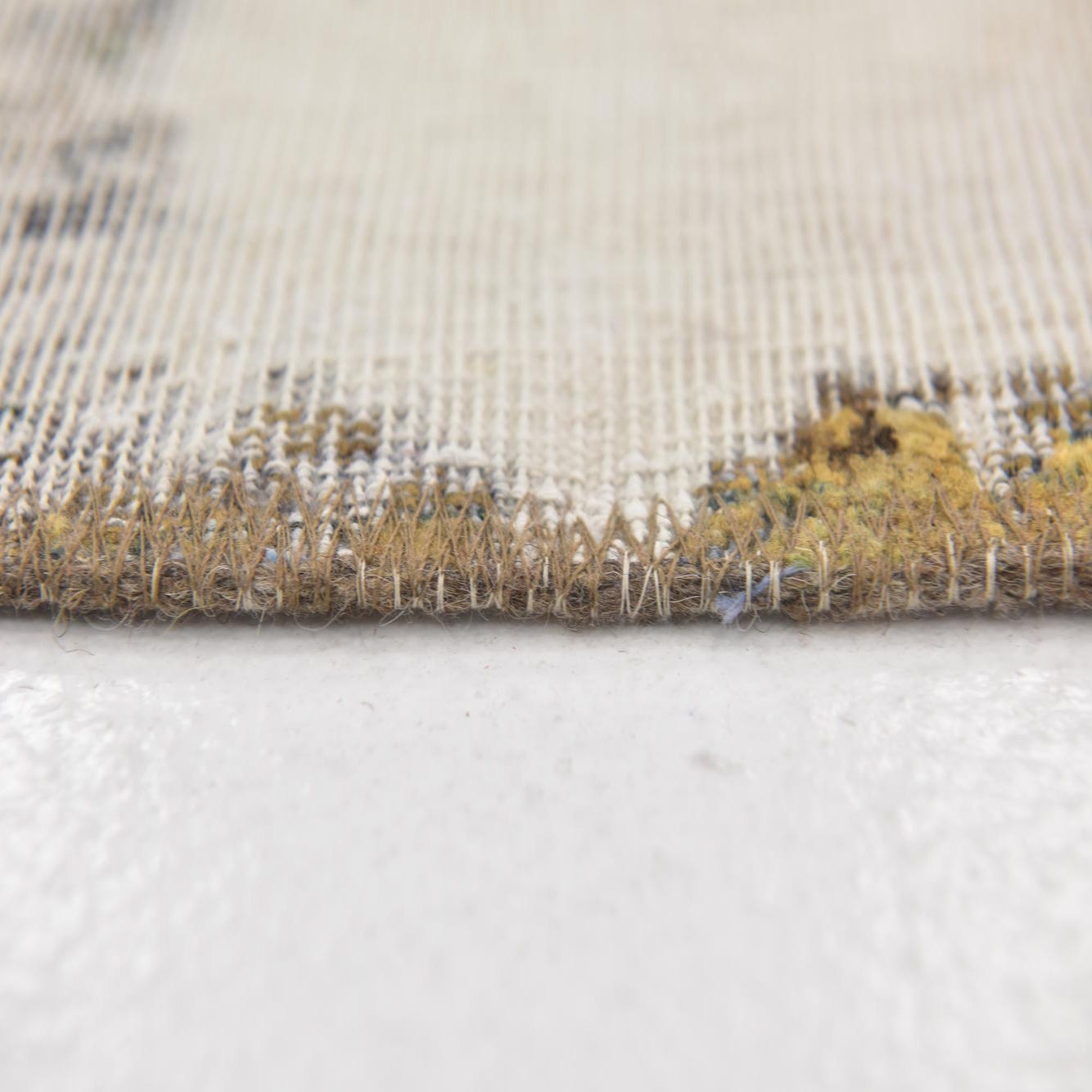The Ultra Vintage collection presents a 5x8 hand-knotted rug crafted from 100% wool, offering a luxurious feel underfoot and notable durability. This rug features a captivating distressed pattern, blending traditional motifs with a contemporary erased effect, achieving an alluring fusion of old-world charm and modern design. The color palette consists of subtle shades such as ivory, beige, brown, light brown, navy blue, and olive, with ivory serving as the dominant background hue. The thoughtful arrangement of colors and the unique texture contribute to the rug's visual interest and overall versatility.