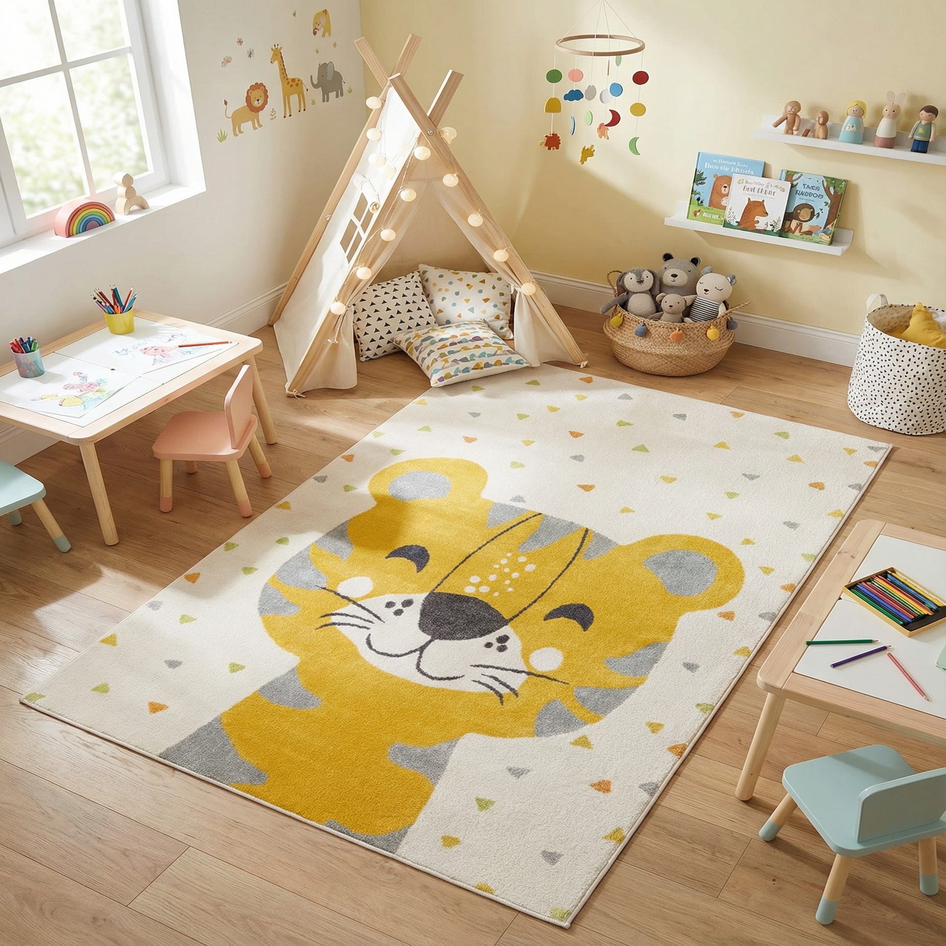 A cheerful tiger motif sits against an ivory field dotted with small triangle confetti in yellow, green and gray, with black accents defining the nose and facial details. The playful, illustrative pattern brings a sense of fun without overwhelming the space. Machine made from 100% polypropylene, the rug has a soft, slightly plush hand with a low-to-medium pile that lays flat for easy furniture placement and everyday use.