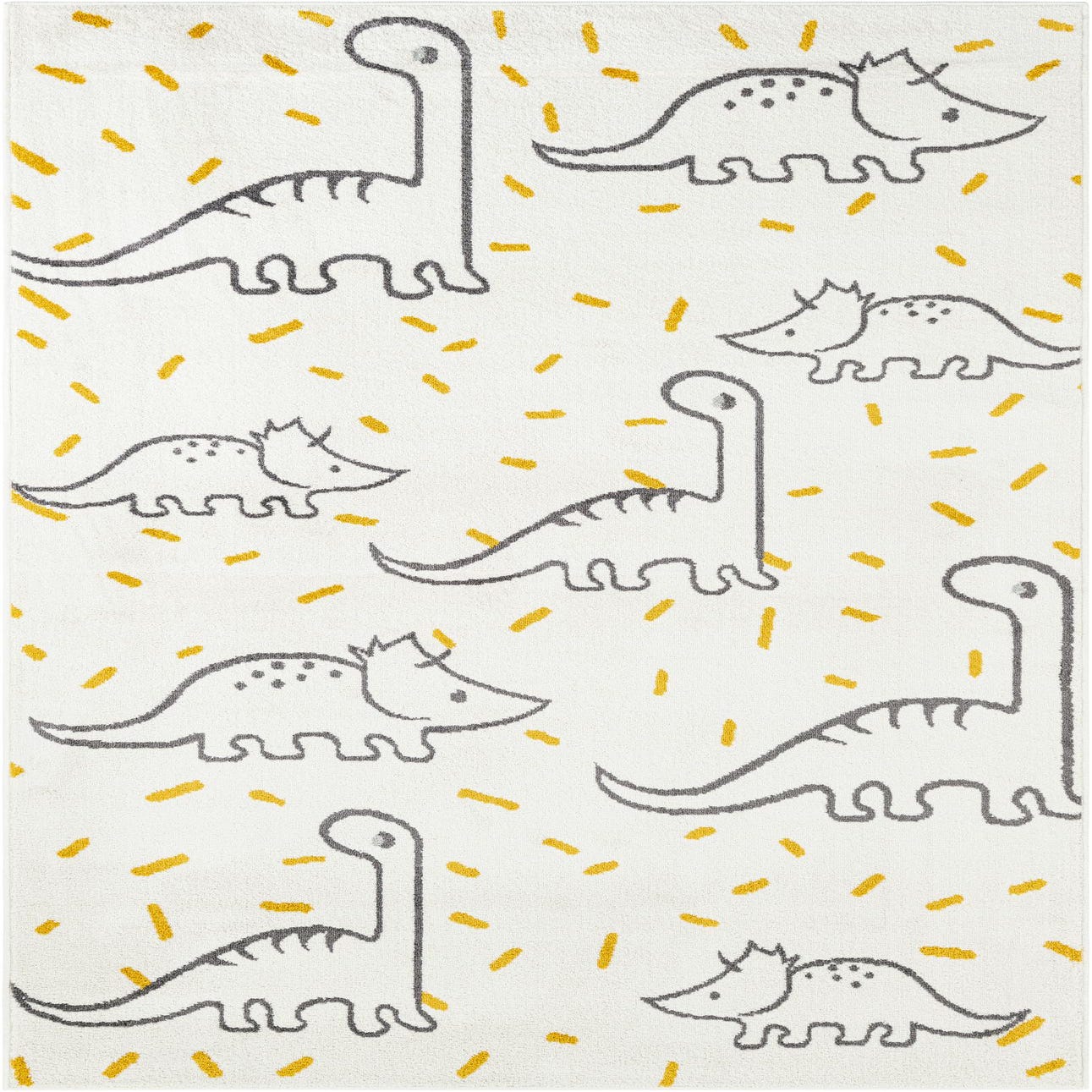 A soft ivory field sets the stage for a playful, hand-drawn dinosaur motif outlined in black, with scattered yellow dash accents that add a cheerful, energetic rhythm across the surface. The sketch-like graphics keep the look light and modern rather than fussy, and the color palette of ivory, yellow and black makes it easy to coordinate with a range of kids’ decor. Woven from 100% polypropylene, the rug has a low, dense pile that feels soft underfoot while maintaining clear, crisp pattern definition.