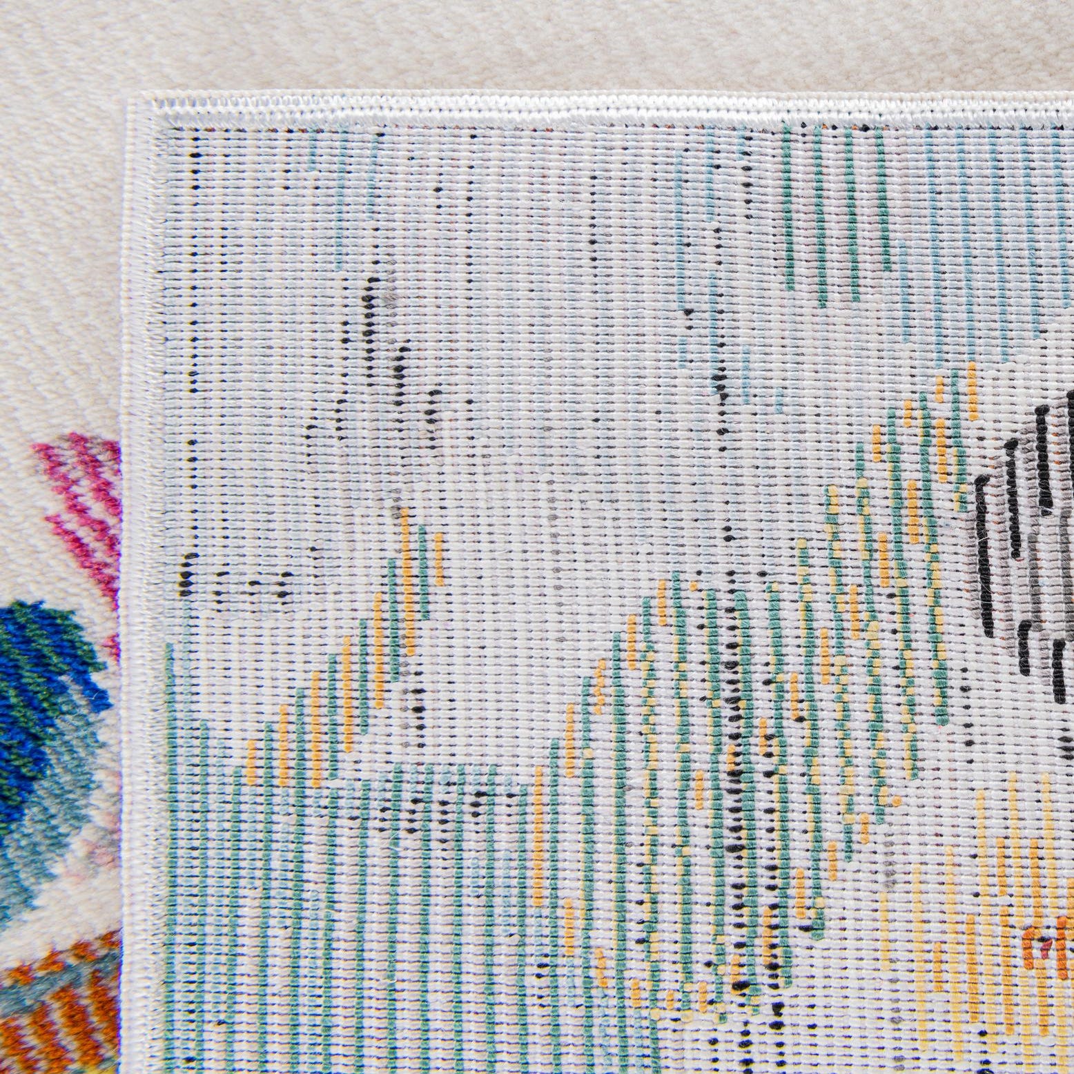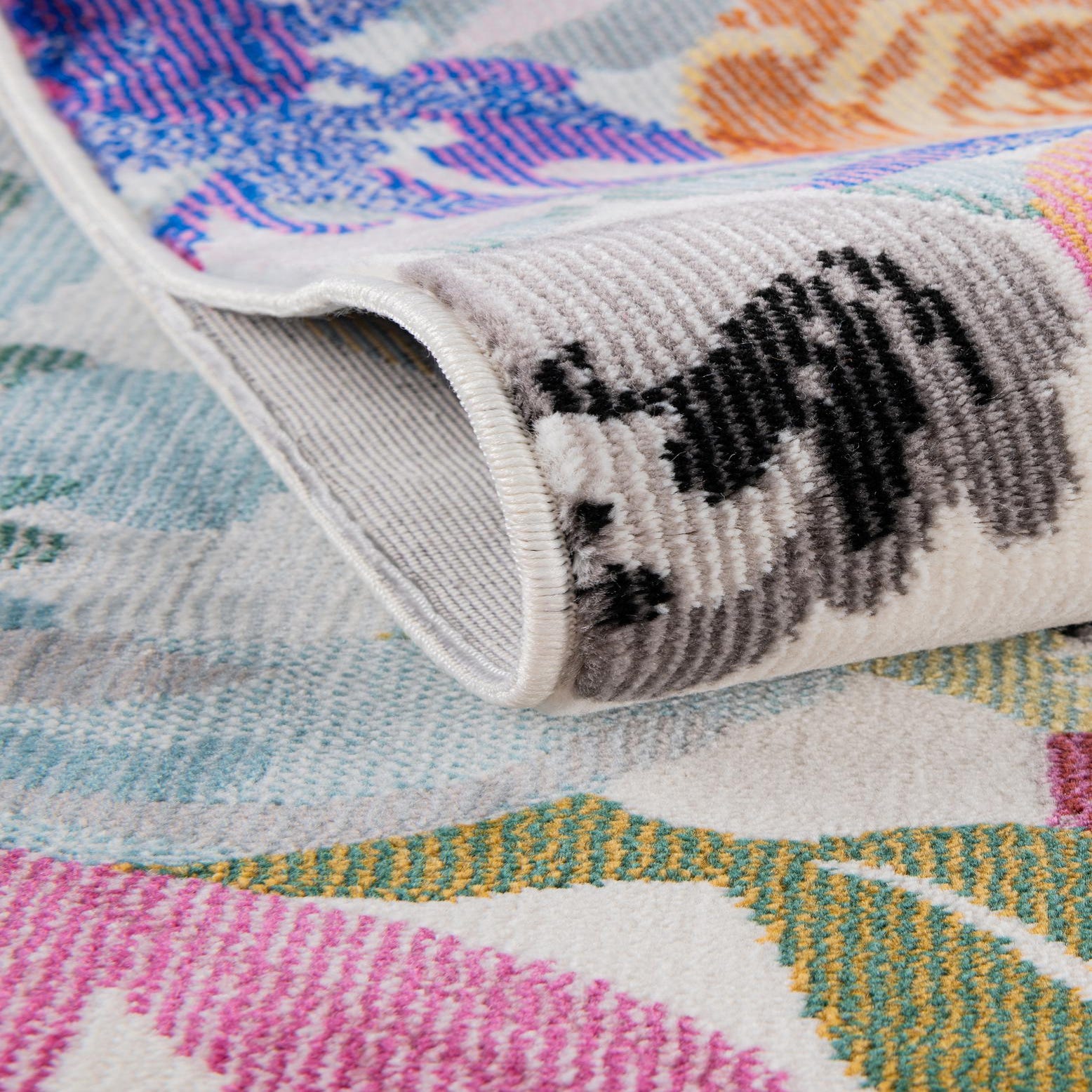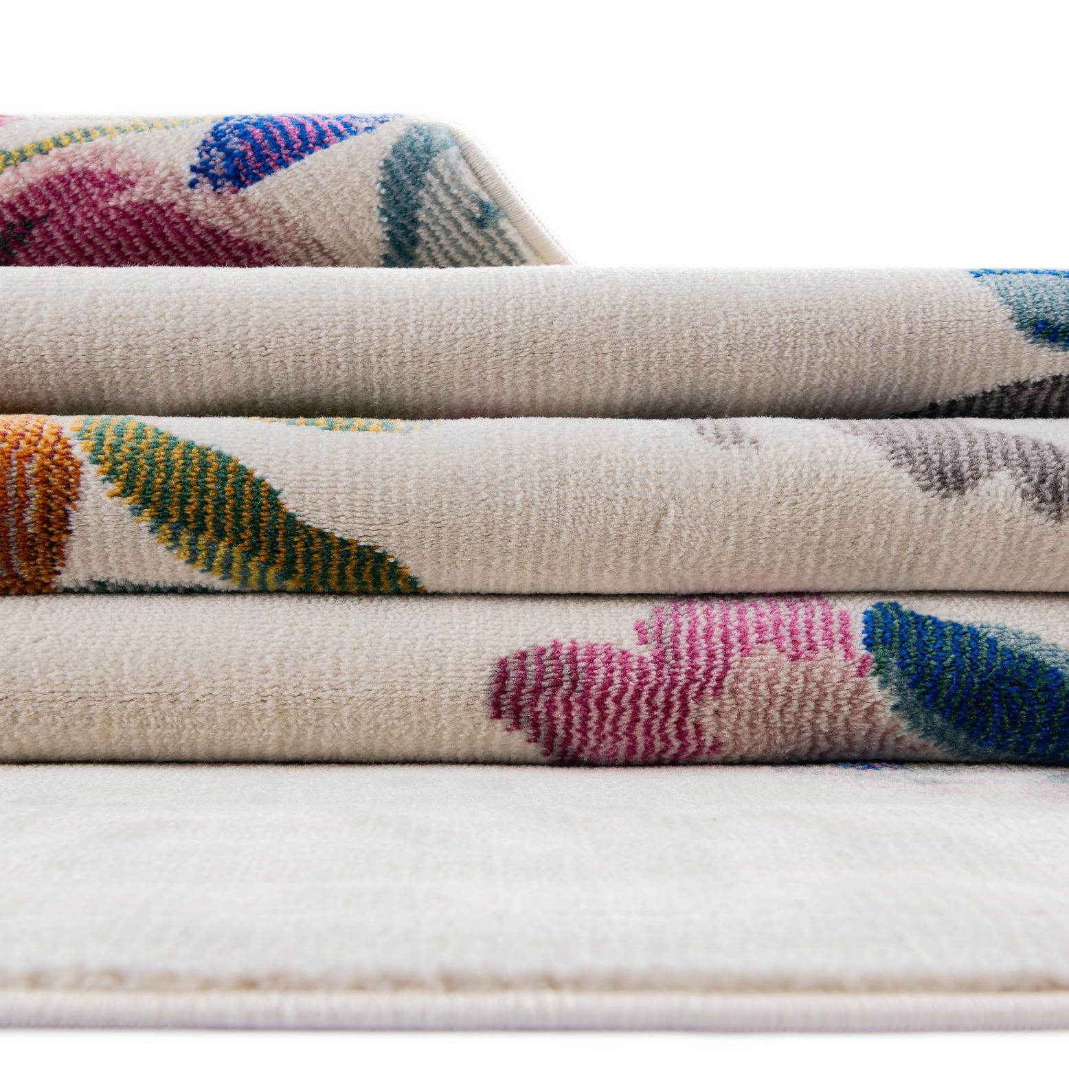 Octagon-shaped and floral, this rug sits on an ivory ground with large, painterly blooms in pink, purple, rust red, olive, brown, blue and light blue, punctuated by black accents. The pattern reads as clusters of roses and loose foliage arranged to let the background breathe, creating an airy, garden-inspired look. Machine-made from 100% polypropylene, the rug has a low-profile, smooth pile that feels pleasantly soft underfoot while keeping the color detail vivid and defined.